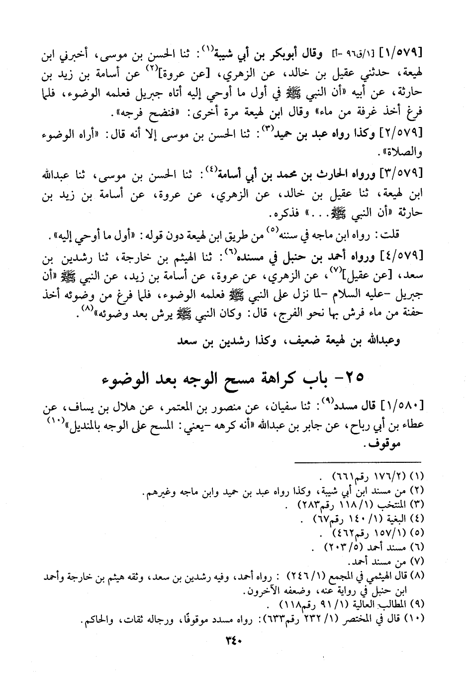 579 / 1 - وَقَالَ أَبُو بَكْرِ بْنُ أَبِي شَيْبَةَ: ثنا الْحَسَنُ بْنُ مُوسَى، أَخْبَرَنِي ابْنُ لَهِيعَةَ، حَدَّثَنِي عُقَيْلُ بْنُ خَالِدٍ، عَنِ الزُّهْرِيِّ، عَنْ عُرْوَةَ عَنْ أُسَامَةَ بْنِ زَيْدِ بْنِ حَارِثَةَ، عَنْ أَبِيهِ "أَنّ النَّبِيَّ - صَلَّى اللَّهُ عَلَيْهِ وسلم - فِي أَوَّلِ مَا أُوحِيَ إِلَيْهِ أَتَاهُ جِبْرِيلُ فَعَلَّمَهُ الْوُضُوءَ، فَلَمَّا فَرَغَ أَخَذَ غُرْفَةً مِنْ مَاءٍ" وَقَالَ ابْنُ لَهِيعَةَ مَرَّةً أُخْرَى: "فَنَضَحَ فَرْجَهُ ".
