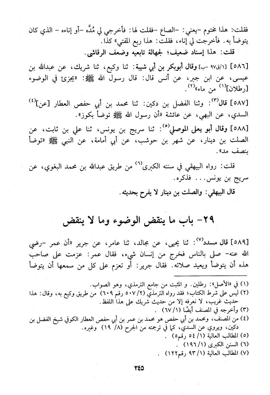 586 - وقال أبو بكر بن أيي شَيْبَةَ: ثنا وَكِيعٌ، ثَنَا شَرِيكٌ، عَنْ عَبْدِ اللَّهِ بْنِ عِيسَى، عن ابن جبر، عَنْ أَنَسٍ قَالَ: قَالَ رَسُولُ اللَّهِ - صَلَّى اللَّهُ عَلَيْهِ وسلم -: يجزئ في الوضوء رطلان مِنْ مَاءٍ".