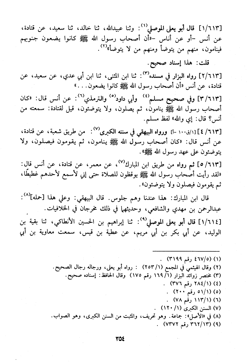 613 / 1 - قَالَ أَبُو يَعْلَى الْمَوْصِلِيُّ: وَثَنَا عُبَيْدُ اللَّهِ، ثَنَا خَالِدٌ، ثَنَا سَعِيدٌ، عَنْ قَتَادَةَ، عَنْ أنس- أو عن أناس- "أَنَّ أَصْحَابَ رَسُولِ اللَّهِ - صَلَّى اللَّهُ عَلَيْهِ وَسَلَّمَ - كَانُوا يَضَعُونَ جُنُوبَهُمْ فَيَنَامُونَ، مِنْهُمْ مَنْ يَتَوَضَّأُ وَمِنْهُمْ مَنْ لَا يَتَوَضَّأُ".
