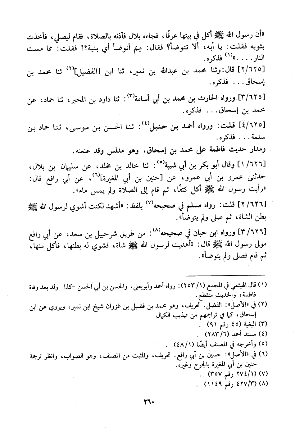 626 / 1 - وَقَالَ أَبُو بَكْرِ بْنُ أَبِي شَيْبَةَ: ثنا خَالِدُ بْنُ مَخْلَدٍ، عَنْ سُلَيْمَانَ بْنِ بِلَالٍ، حَدَّثَنِي عَمْرُو بْنُ أَبِي عمرو، عن حنين بن أبي المغيرة عَنْ أَبِي رَافِعٍ قَالَ: "رَأَيْتُ رَسُولَ اللَّهِ - صَلَّى اللَّهُ عَلَيْهِ وَسَلَّمَ - أَكَلَ كَتِفًا، ثُمَّ قام إِلَى الصَّلَاةِ وَلَمْ يَمَسَّ مَاءً".