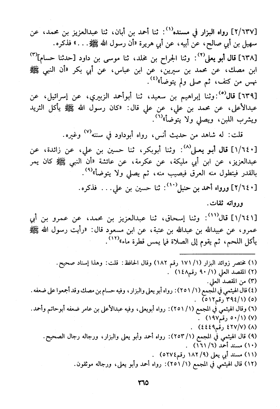 640 / 1 - قَالَ أَبُو يَعْلَى: وثنا أَبُو بَكْرٍ، ثَنَا حُسَيْنُ بْنُ عَلِيٍّ، عَنْ زَائِدَةَ، عَنْ عَبْدِ الْعَزِيزِ، عَنِ ابْنِ أَبِي مَلِيكَةَ، عَنْ عِكْرِمَةَ، عَنْ عَائِشَةَ "أَنَّ النَّبِيَّ - صَلَّى اللَّهُ عَلَيْهِ وَسَلَّمَ - كَانَ يمر بالقدر فيتطول مِنْهُ الْعِرْقَ فَيُصِيبُ مِنْهُ، ثُمَّ يُصَلِّي وَلَا يَتَوَضَّأُ".