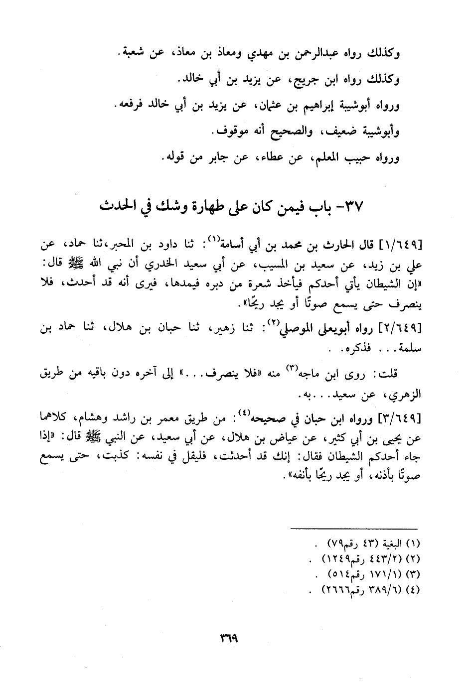 649 / 1 - قَالَ الْحَارِثُ بْنُ مُحَمَّدِ بْنِ أَبِي أُسَامَةَ: ثَنَا دَاوُدُ بْنُ الْمُحَبَّرِ، ثَنَا حَمَّادٌ، عَنْ عَلِيِّ بْنِ زَيْدٍ، عَنْ سَعِيدِ بْنِ الْمُسَيِّبِ، عَنْ أَبِي سَعِيدٍ الْخُدْرِيِّ أَنَّ نَبِيَّ اللَّهِ - صَلَّى اللَّهُ عَلَيْهِ وَسَلَّمَ - قَالَ: "إِنَّ الشَّيْطَانَ يَأْتِي أَحَدَكُمْ فَيَأْخُذُ شَعْرَةً مِنْ دُبُرِهِ فَيَمُدُّهَا، فَيَرَى أَنَّهُ قَدْ أَحْدَثَ، فَلَا يَنْصَرِفْ حَتَّى يَسْمَعَ صَوْتًا أَوْ يَجِدَ رِيحًا".