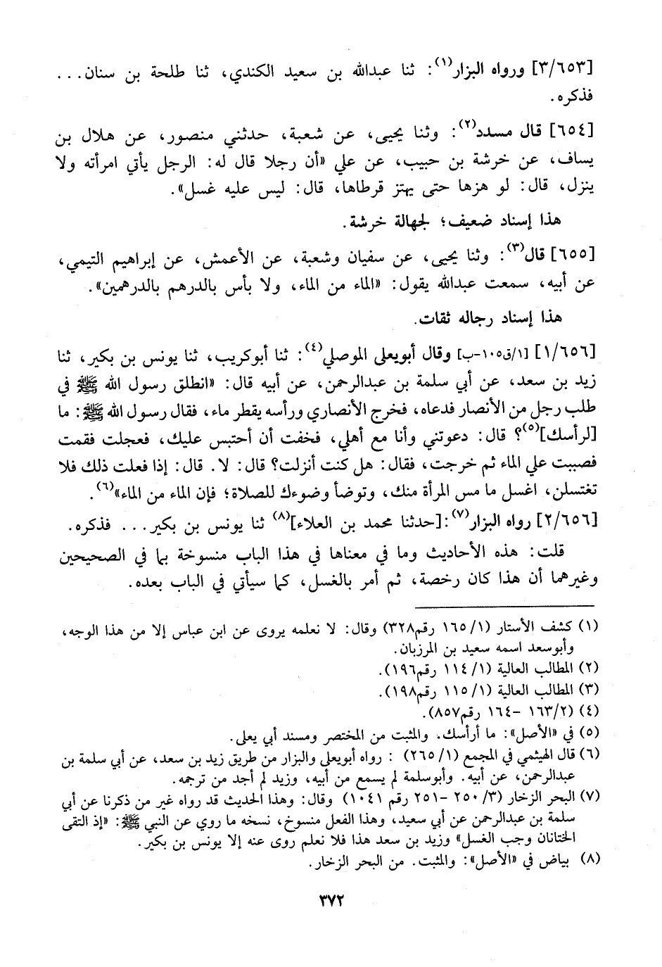 قُلْتُ: هَذِهِ الْأَحَادِيثُ وَمَا فِي مَعْنَاهَا فِي هَذَا الْبَابِ مَنْسُوخَةٌ بِمَا فِي الصَّحِيحَيْنِ وَغَيْرِهِمَا أَنَّ هَذَا كَانَ رُخْصَةً، ثُمَّ أُمِرَ بِالْغُسْلِ، كَمَا سَيَأْتِي فِي الْبَابِ بَعْدَهُ.