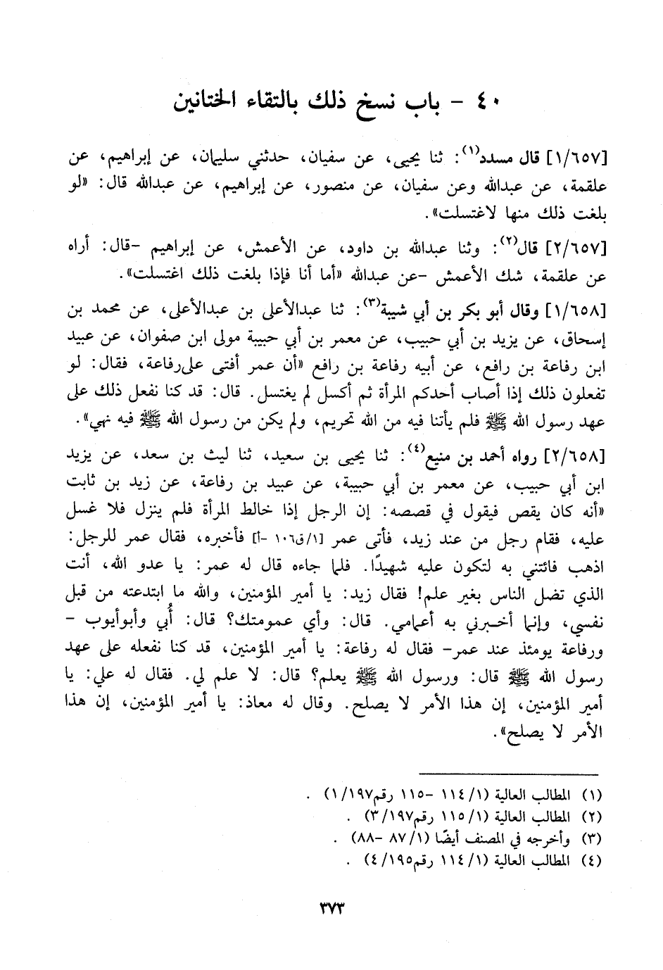 658 / 2 - رواه أحمد به مَنِيعٍ: ثنا يَحْيَى بْنُ سَعِيدٍ، ثَنَا لَيْثُ بن سعد، عن يزيد ابن أَبِي حَبِيبٍ، عَنْ مَعْمَرِ بْنِ أَبِي حُبَيِّبَةَ، عَنْ عُبَيْدِ بْنِ رِفَاعَةَ، عَنْ زَيْدِ بْنِ ثَابِتٍ "أَنَّهُ كَانَ يَقُصُّ فَيَقُولُ فِي قَصَصِهِ: أَنَّ الرَّجُلَ إِذَا خَالَطَ الْمَرْأَةَ فَلَمْ يُنْزِلْ فَلَا غُسْلَ عَلَيْهِ فَقَامَ رَجُلٌ مِنْ عِنْدِ زَيْدٍ، فَأَتَى عُمَرَ فَأَخْبَرَهُ، فَقَالَ عُمَرُ لِلرَّجُلِ: اذهب فائتني بِهِ لِتَكُونَ عَلَيْهِ شَهِيدًا. فَلَمَّا جَاءَهُ قَالَ لَهُ عُمَرُ: يَا عَدُوَّ اللَّهِ، أَنْتَ الَّذِي تُضِلُّ النَّاسَ بِغَيْرِ عِلْمٍ! فَقَالَ زَيْدٌ: يَا أَمِيرَ الْمُؤْمِنِينَ، وَاللَّهِ مَا ابْتَدَعْتُهُ مِنْ قِبَلِ نَفْسِي، وَإِنَّمَا أَخْبَرَنِي بِهِ أَعْمَامِي. قَالَ: وَأَيُّ عُمُومَتِكَ؟ قَالَ: أُبي وَأَبُو أَيُّوبَ- وَرِفَاعَةُ يَوْمَئِذٍ عِنْدَ عُمَرَ- فَقَالَ لَهُ رِفَاعَةُ: يَا أَمِيرَ الْمُؤْمِنِينَ، قَدْ كُنَّا نَفْعَلُهُ عَلَى عَهْدِ رَسُولِ اللَّهِ - صَلَّى اللَّهُ عَلَيْهِ وَسَلَّمَ - قَالَ: وَرَسُولُ اللَّهِ- صَلَّى اللَّهُ عَلَيْهِ وَسَلَّمَ - يَعْلَمُ؟ قَالَ: لَا عِلْمَ لِي. فَقَالَ لَهُ عَلِيٌّ: يَا أَمِيرَ الْمُؤْمِنِينَ، إِنَّ هَذَا الْأَمْرَ لَا يَصْلُحُ. وقالت لَهُ مُعَاذٌ: يَا أَمِيرَ الْمُؤْمِنِينَ، إِنَّ هَذَا الأمر لا يصلح ".