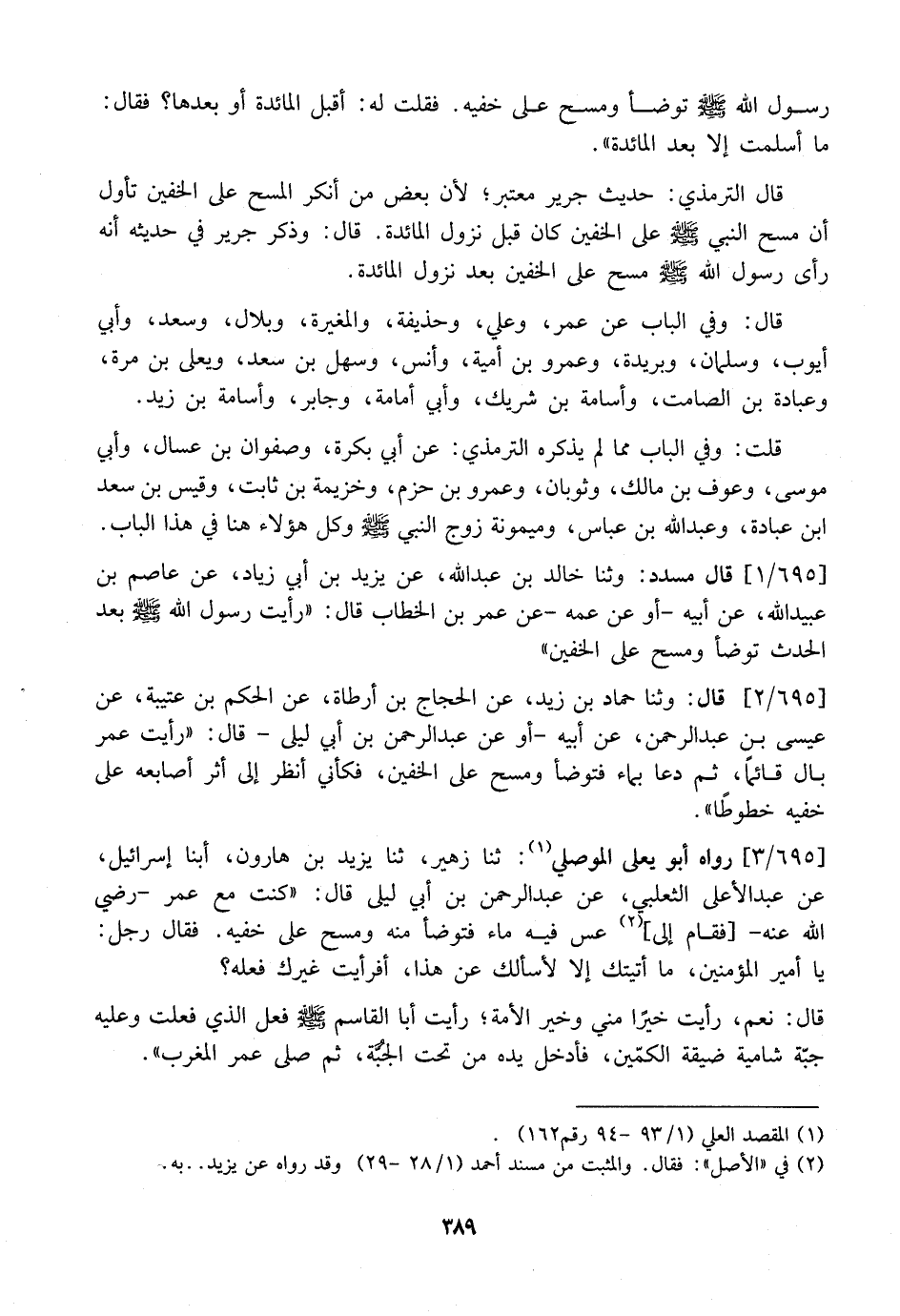 695 / 3 - رَوَاهُ أَبُو يَعْلَى الْمَوْصِلِيُّ: ثَنَا زُهَيْرٌ، ثَنَا يَزِيدُ بن هارون، أبنا إِسْرَائِيلُ، عَنْ عَبْدِ الْأَعْلَى الثَّعْلَبِيِّ، عَنْ عَبْدِ الرَّحْمَنِ بْنِ أَبِي لَيْلَى قَالَ: "كُنْتُ مَعَ عُمَرَ- رَضِيَ اللَّهُ عَنْهُ- فَقَامَ إِلَى عَسٍّ فِيهِ مَاءٌ فَتَوَضَّأَ مِنْهُ وَمَسَحَ عَلَى خُفَّيْهِ. فَقَالَ رَجُلٌ: يَا أَمِيرَ الْمُؤْمِنِينَ، مَا أَتَيْتُكَ إِلَّا لِأَسْأَلُكَ عَنْ هَذَا، أَفَرَأَيْتَ غَيْرَكَ فَعَلَهُ؟