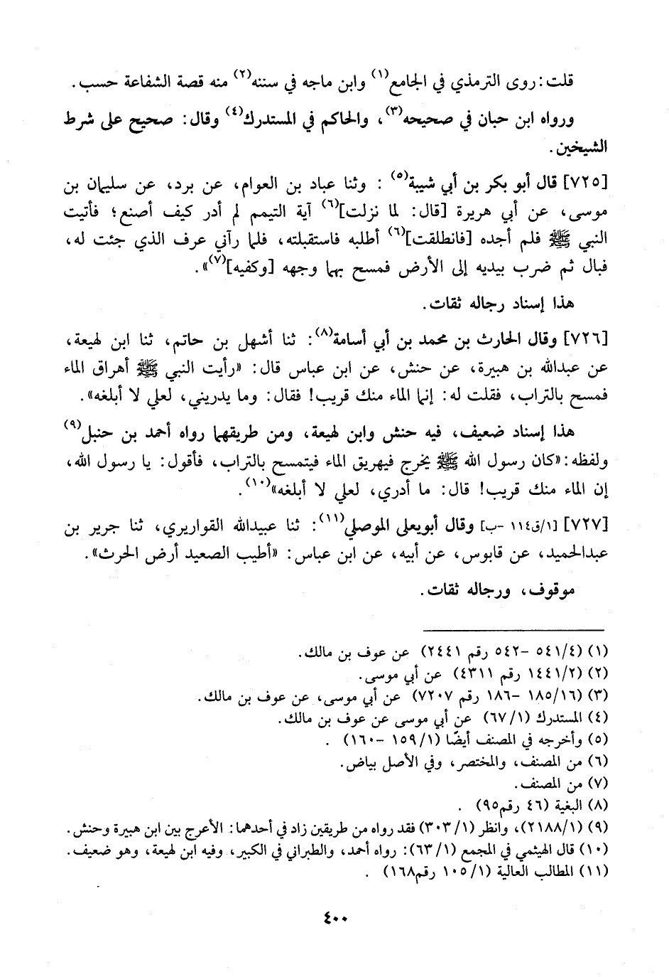 726 - وَقَالَ الْحَارِثُ بْنُ مُحَمَّدِ بْنِ أَبِي أُسَامَةَ: ثَنَا أَشْهَلُ بْنُ حَاتِمٍ، ثَنَا ابْنُ لَهِيعَةَ، عَنْ عَبْدِ اللَّهِ بْنِ هُبَيْرَةَ، عَنْ حَنَشٍ، عَنِ ابْنِ عَبَّاسٍ قَالَ: "رَأَيْتُ النَّبِيَّ - صَلَّى اللَّهُ عَلَيْهِ وَسَلَّمَ - أهراق الماء فمسح بِالتُّرَابِ، فَقُلْتُ لَهُ: إِنَّمَا الْمَاءُ مِنْكَ قَرِيبٌ! فَقَالَ: وَمَا يُدْرِينِي، لَعَلِّي لَا أَبْلُغُهُ ".