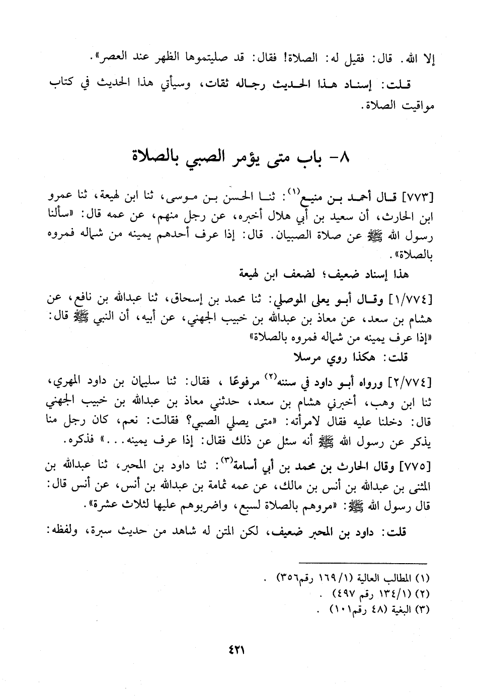 773 - قَالَ أَحْمَدُ بْنُ مَنِيعٍ: ثَنَا الْحَسَنُ بْنُ مُوسَى، ثَنَا ابْنُ لَهِيعَةَ، ثَنَا عَمْرُو بْنُ الْحَارِثِ، أَنَّ سَعِيدَ بْنَ أَبِي هِلَالٍ أَخْبَرَهُ، عَنْ رَجُلٍ مِنْهُمْ، عَنْ عَمِّهِ قَالَ: "سَأَلْنَا رَسُولَ اللَّهِ - صَلَّى اللَّهُ عَلَيْهِ وَسَلَّمَ - عن صَلَاةِ الصِّبْيَانِ. قَالَ: إِذَا عَرَفَ أَحَدُهُمْ يَمِينَهُ مِنْ شِمَالِهِ فَمُرُوهُ بِالصَّلَاةِ".
