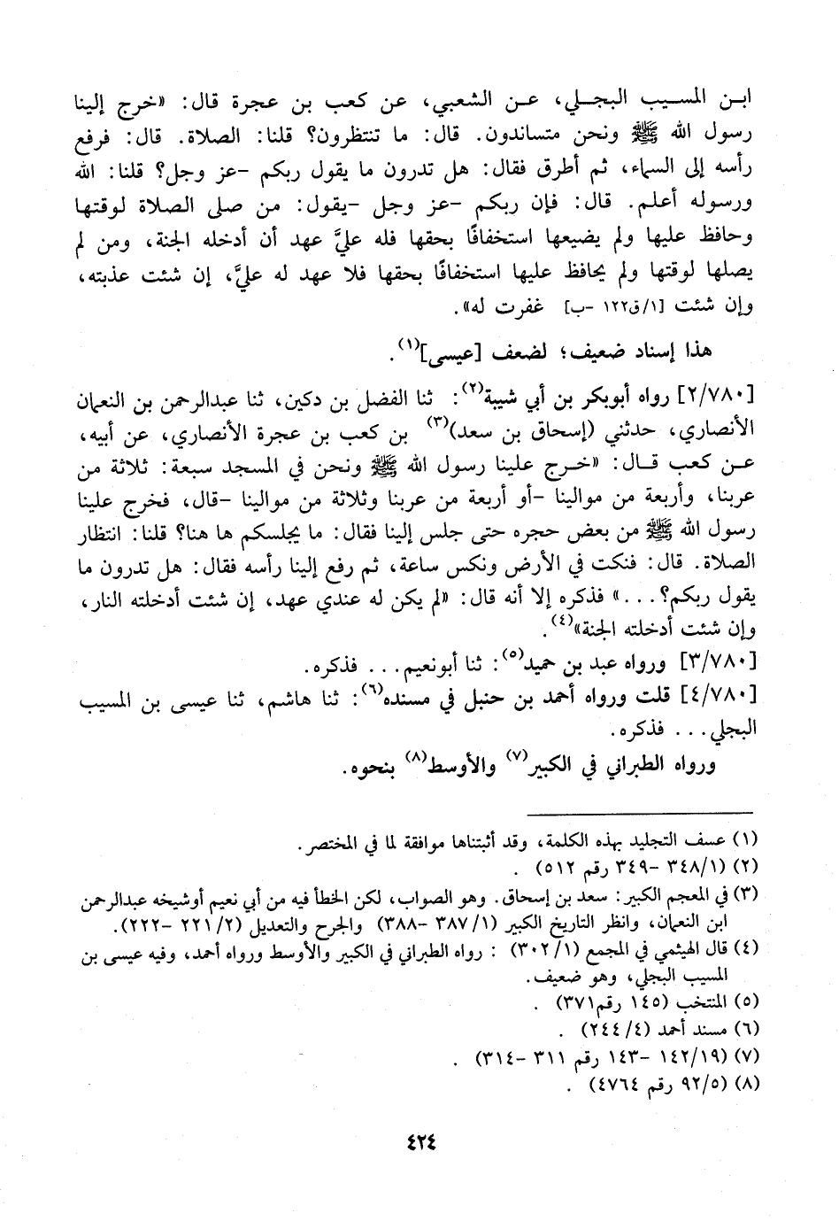 780 / 4 - قُلْتُ وَرَوَاهُ أَحْمَدُ بْنُ حَنْبَلٍ فِي مُسْنَدِهِ: ثَنَا هَاشِمُ، ثَنَا عِيسَى بْنُ الْمُسَيَّبِ الْبَجَلِيُّ ... فذكره. وَرَوَاهُ الطَّبَرَانِيُّ فِي الْكَبِيرِ وَالْأَوْسَطِ بِنَحْوِهُ.