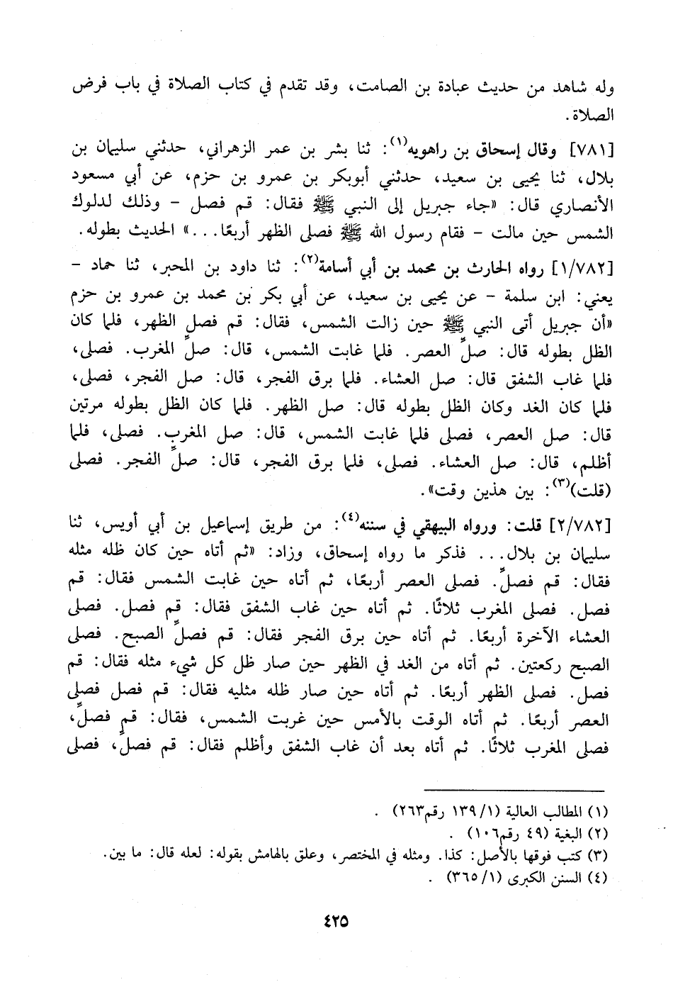 782 / 1 - رَوَاهُ الْحَارِثُ بْنُ مُحَمَّدِ بْنِ أَبِي أُسَامَةَ: ثنا دَاوُدُ بْنُ الْمُحَبَّرِ، ثَنَا حَمَّادٌ- يَعْنِي: ابْنَ سَلَمَةَ- عَنْ يَحْيَى بْنِ سَعِيدٍ، عَنْ أَبِي بَكْرِ بْنِ مُحَمَّدِ بْنِ عَمْرِو بْنِ حَزْمٍ "أَنَّ جِبْرِيلَ أَتَى النَّبِيَّ - صَلَّى اللَّهُ عَلَيْهِ وَسَلَّمَ - حِينَ زَالَتِ الشَّمْسُ، فَقَالَ: قُمْ فَصَلِّ الظُّهْرَ، فَلَمَّا كَانَ الظِّلُّ بِطُولِهِ قَالَ: صلِّ الْعَصْرَ. فَلَمَّا غَابَتِ الشَّمْسُ، قَالَ: صلَ الْمَغْرِبَ. فَصَلَّى، فَلَمَّا غَابَ الشَّفَقُ قَالَ: صَلِّ الْعِشَاءَ. فَلَمَّا بَرَقَ الْفَجْرُ، قَالَ: صَلِّ الْفَجْرَ، فَصَلَّى، فَلَمَّا كَانَ الْغَدُ وَكَانَ الظِّلُّ بِطُولِهِ قَالَ: صل الظهر. فَلَمَّا كَانَ الظِّلُّ بِطُولِهِ مَرَّتَيْنِ قَالَ؟ صَلِّ الْعَصْرَ، فَصَلَّى فَلَمَّا غَابَتِ الشَّمْسُ، قَالَ: صَلِّ الْمَغْرِبَ. فَصَلَّى، فَلَمَّا أَظْلَمَ، قَالَ: صَلِّ الْعِشَاءَ. فصلى، فَلَمَّا بَرَقَ الْفَجْرُ، قَالَ: صلِّ الْفَجْرَ. فَصَلَّى (قُلْتُ) : بَيْنَ هَذَيْنِ وَقْتٌ ".