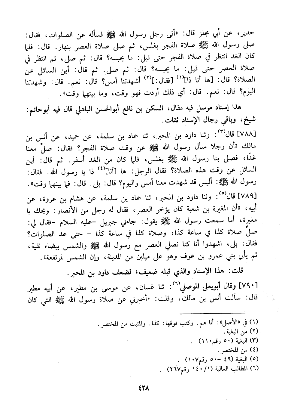 788 - قَالَ: وثنا دَاوُدُ بْنُ الْمُحَبَّرِ، ثَنَا حَمَّادُ بْنُ سَلَمَةَ، عَنْ حُمَيْدٍ، عَنْ أَنَسِ بْنِ مَالِكٍ "أَنَّ رَجُلًا سَأَلَ رَسُولَ اللَّهِ - صَلَّى اللَّهُ عَلَيْهِ وَسَلَّمَ - عن وَقْتِ صَلَاةِ الْفَجْرِ؟ فَقَالَ: صلِّ مَعَنَا غَدًا، فَصَلَّى بِنَا رَسُولُ اللَّهِ - صَلَّى اللَّهُ عَلَيْهِ وَسَلَّمَ - بِغَلْسٍ، فَلَمَّا كَانَ مِنَ الْغَدِ أَسْفَرَ، ثُمَّ قَالَ: أَيْنَ السَّائِلُ عَنْ وَقْتِ هَذِهِ الصَّلَاةِ؟ فَقَالَ الرَّجُلُ: هَا أَنَا ذَا يَا رَسُولُ اللَّهِ. فَقَالَ: رَسُولُ اللَّهِ- صَلَّى اللَّهُ عَلَيْهِ وَسَلَّمَ -: أَلَيْسَ قَدْ شَهِدْتَ مَعَنَا أَمْسِ وَالْيَوْمَ؟ قَالَ: بَلَى. قَالَ: فَمَا بَيْنَهُمَا وَقْتٌ ".