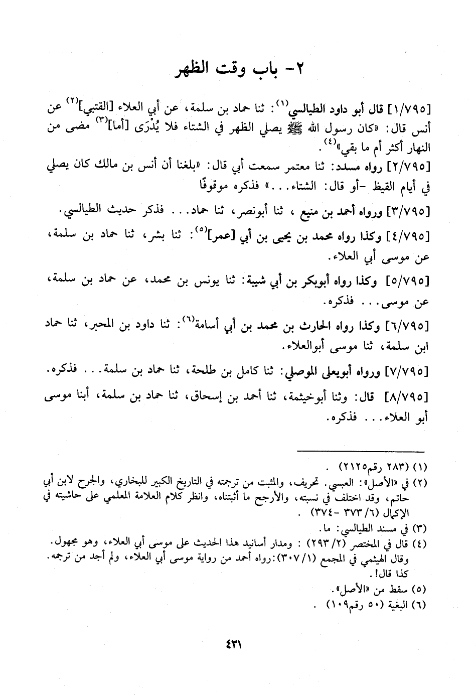 795 / 8 - قَالَ: وَثَنَا أبو خيثمة، ثَنَا أَحْمَدُ بْنُ إِسْحَاقَ، ثَنَا حَمَّادُ بْنُ سَلَمَةَ، أبنا مُوسَى أَبُو الْعَلَاءِ ... فذكره.