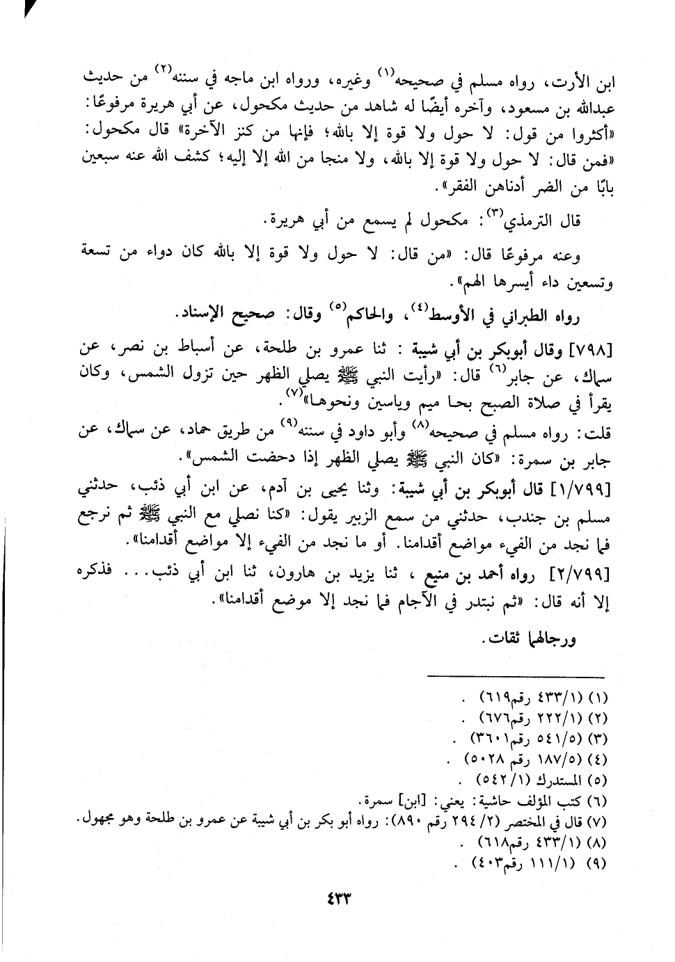 798 - وَقَالَ أَبُو بَكْرِ بْنُ أَبِي شَيْبَةَ: ثنا عَمْرُو بْنُ طَلْحَةَ، عَنْ أَسْبَاطِ بْنِ نَصْرٍ، عَنْ سِمَاكٍ، عن جابر قَالَ: "رَأَيْتُ النَّبِيَّ - صَلَّى اللَّهُ عَلَيْهِ وَسَلَّمَ - يُصَلِّي الظُّهْرَ حِينَ تَزُولُ الشَّمْسُ، وَكَانَ يَقْرَأُ في صلاة الصبح بحا ميم وَيَاسِينْ وَنَحْوِهَا". قُلْتُ: رَوَاهُ مُسْلِمٌ فِي صَحِيحِهِ وَأَبُو دَاوُدَ فِي سُنَنِهِ مِنْ طَرِيقِ حَمَّادٍ، عَنْ سَمَّاكٍ، عَنْ جَابِرِ بْنِ سَمُرَةَ: "كَانَ النَّبِيُّ - صَلَّى اللَّهُ عَلَيْهِ وَسَلَّمَ - يُصَلِّي الظهر إِذَا دَحَضَتِ الشَّمْسُ ".