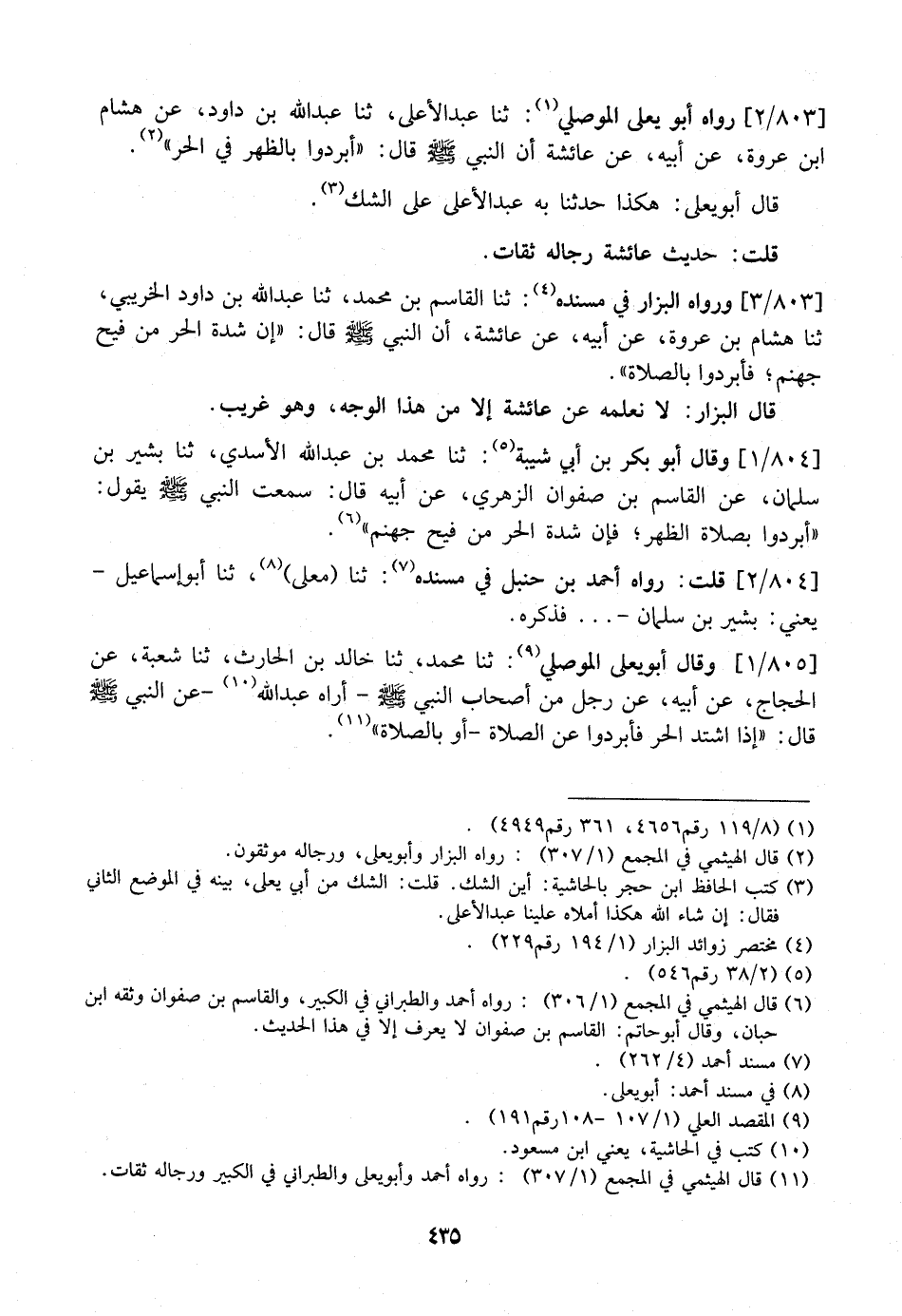 803 / 2 - رَوَاهُ أَبُو يَعْلَى الْمَوْصِلِيُّ: ثَنَا عَبْدُ الْأَعْلَى، ثَنَا عَبْدُ اللَّهِ بْنُ دَاوُدَ، عَنْ هِشَامِ بْنِ عُرْوَةَ، عَنْ أَبِيهِ، عَنْ عَائِشَةَ أَنَّ النَّبِيَّ - صَلَّى اللَّهُ عَلَيْهِ وَسَلَّمَ - قَالَ: "أَبْرِدُوا بِالظُّهْرِ فِي الْحَرِّ".