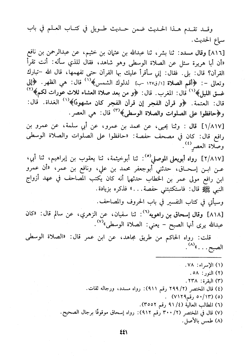 816 - وَقَالَ مُسَدَّدٌ: ثَنَا بِشْرٌ، ثَنَا عَبْدُ اللَّهِ بْنُ عُثْمَانَ بْنِ خُثَيْمٍ، عَنْ عَبْدِ الرَّحْمَنِ بْنِ نَافِعٍ "أَنَّ أَبَا هُرَيْرَةَ سُئِلَ عَنِ الصَّلَاةِ الْوُسْطَى وَهُوَ شَاهِدٌ، فَقَالَ لِلَّذِي سَأَلَهُ: أَنْتَ تَقْرَأُ الْقُرْآنَ؟ قَالَ: بَلَى. فَقَالَ: إِنِّي سَأَقْرَأُ عَلَيْكَ بِهَا القرآن حَتَّى تَفْهَمَهَا، قَالَ اللَّهُ- تَبَارَكَ وَتَعَالَى-: {أَقِمِ الصلاة} {لدلوك الشمس} قال: هي الظهر. {إلى غسق الليل} وهو قال: المغرب. قال: (ومن بعد صلاة العشاء ثلاث عورات لكم} قال: العتمة. {قرآن الفجر إن قرآن الفجر كان مشهودًا} الغداة. قال: {وحافظوا على الصلوات والصلاة الوسطى} قَالَ: هِيَ الْعَصْرُ.