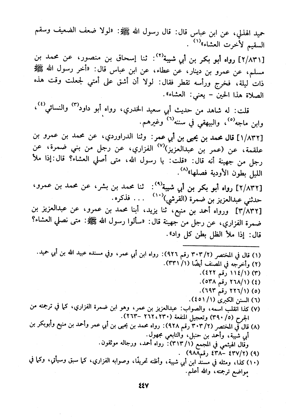 832 / 1 - قَالَ مُحَمَّدُ بْنُ يَحْيَى بْنِ أَبِي عُمَرَ: وَثَنَا الدَّرَاوَرْدِيُّ، عَنْ مُحَمَّدِ بْنِ عَمْرِو بْنِ عَلْقَمَةَ، عَنْ (عمر بن عبد العزيز) الْفَزَارِيِّ، عَنْ رَجُلٍ مِنْ بَنِي ضَمْرَةَ، عَنْ رَجُلٍ مِنْ جُهَيْنَةَ أَنَّهُ قَالَ: "قُلْتُ: يَا رَسُولَ اللَّهِ، مَتَّى أُصَلِّي الْعِشَاءَ؟ قَالَ: إِذَا ملأ الليل بطون الأودية فصلها".