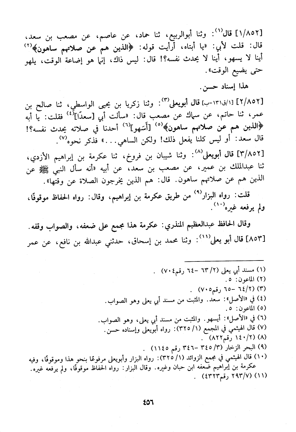 852 / 2 - قَالَ أَبُو يَعْلَى: وَثَنَا زَكَرِيَّا بْنُ يَحْيَى الْوَاسِطِيُّ، ثَنَا صَالِحُ بْنُ عُمَرَ، ثَنَا حَاتِمٌ، عَنْ سَمَّاكٍ عَنْ مُصْعَبٍ قَالَ: سَأَلْتُ أَبِي سَعْدًا فَقُلْتُ: يَا أبه {الذين هم عن صلاتهم ساهون} أَسَهو أَحَدُنَا فِي صَلَاتِهِ يُحَدِّثُ نَفْسَهُ؟! قَالَ سَعْدٌ: أَوَ لَيْسَ كُلُّنَا يَفْعَلُ ذَلِكَ! وَلَكِنَّ السَّاهِيَ ... " فذكر نَحْوَهُ.