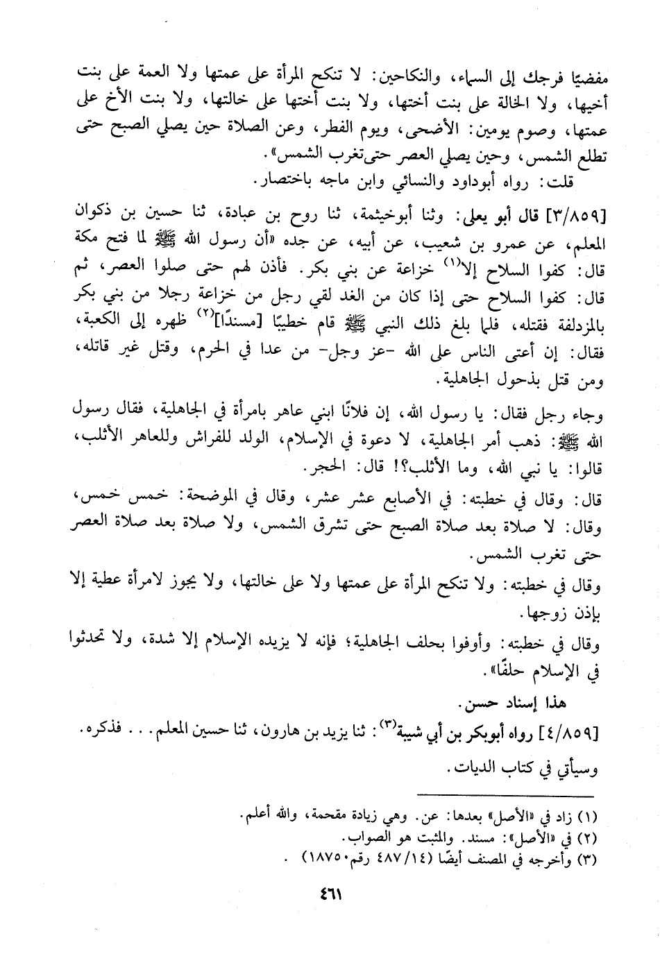 859 / 4 - رَوَاهُ أَبُو بَكْرِ بْنُ أَبِي شَيْبَةَ: ثَنَا يَزِيدُ بْنُ هَارُونَ، ثَنَا حُسَيْنٌ الْمُعَلِّمُ.. فذكره. وَسَيَأْتِي فِي كِتَابِ الدِّيَاتِ.