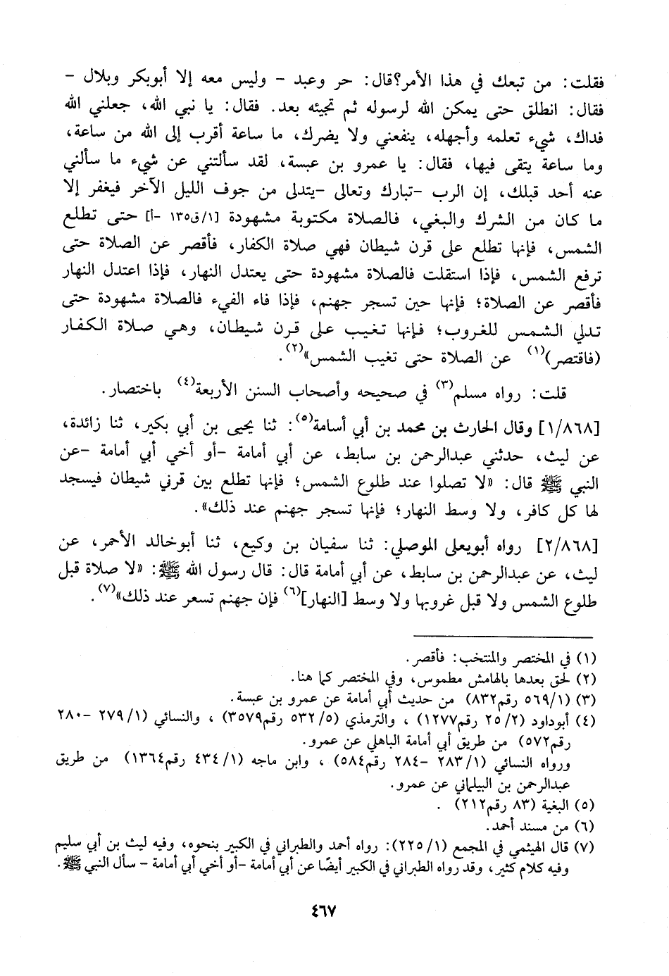 فَقُلْتُ: مَنْ تَبِعَكَ فِي هَذَا الْأَمْرِ؟ قَالَ: حُرٌّ وَعَبْدٌ- وَلَيْسَ مَعَهُ إِلَّا أَبوُ بَكْرٍ وبلال- فقال: انطلق حتى يمكن الله لرسوله ثُمَّ تَجِيئَهُ بَعْدُ. فَقَالَ: يَا نَبِيَّ اللَّهِ، جَعَلَنِي اللَّهُ فِدَاكَ، شَيْءٌ تَعْلَمُهُ وَأَجْهَلُهُ، يَنْفَعَنِي وَلَا يَضُرُّكَ، مَا سَاعَةٌ أَقْرَبُ إِلَى اللَّهِ مِنْ سَاعَةٍ، وَمَا سَاعَةٌ يُتَّقَى فِيهَا، فَقَالَ: يَا عَمْرُو بْنَ عَبْسَةَ، لَقَدْ سَأَلْتَنِي عَنْ شَيْءٍ مَا سَأَلَنِي عَنْهُ أَحْدٌ قَبْلَكَ، إِنَّ الرَّبَّ- تَبَارَكَ وَتَعَالَى- يَتَدَلَّى مِنْ جَوْفِ اللَّيْلِ الْآخِرِ فَيَغْفِرُ إِلَّا مَا كَانَ مِنَ الشِّرْكِ وَالْبَغْيِ، فَالصَّلَاةُ مَكْتُوبَةٌ مَشْهُودَةٌ حَتَّى تَطْلُعَ الشَّمْسُ، فَإِنَّهَا تَطْلُعُ عَلَى قَرْنِ شَيْطَانٍ فَهِيَ صَلَاةُ الكفار، فأقصر عن الصلاة حتى ترفع الشمس، فإذا استقلت فالصلاة مشهودة حتى يعتدل النهار، فَإِذَا اعتدل النهار فَأَقْصِرْ عَنِ الصَّلَاةِ؟ فَإِنَّهَا حِينَ تَسْجُرُ جَهَنَّمُ، فَإِذَا فَاءَ الْفَيْءُ فَالصَّلَاةُ مَشْهُودَةٌ حَتَّى تُدَلَّى الشَّمْسُ لِلْغُرُوبِ؟ فَإِنَّهَا تغيب على قرن شيطان، وهي صلاة الكفار (فاقتصر) عن الصلاة حتى تغيب الشمس ".
