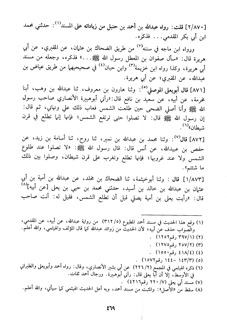 871 - قَالَ أَبوُ يَعْلَى الْمَوْصِلِيُّ: وثنا هَارُونُ بْنُ مَعْرُوفِ، ثَنَا عَبْدُ اللَّهِ بْنُ وهب، أبنا مَخْرَمَةُ، عَنْ أَبِيهِ، عَنْ سَعيِدِ بْنِ نَافِعٍ قَالَ: "رَآنِي أَبُو هُبَيْرَةَ الْأَنْصَارِيُّ صَاحِبُ رَسُولِ اللَّهِ - صَلَّى اللَّهُ عَلَيْهِ وَسَلَّمَ - وَأَنَا أُصَلِّي الضحى حين طلعت الشمس فعاب ذلك عَلَيَّ وَنَهَانِي، ثُمَّ قَالَ: إِنَّ رَسُولَ اللَّهِ - صَلَّى اللَّهُ عَلَيْهِ وَسَلَّمَ - قَالَ: لَا تُصَلُّوا حَتَّى تَرْتَفِعَ الشَّمْسُ؛ فَإِنَّهَا إِنَّمَا تَطْلُعُ فِي قَرْنِ شَيْطَانٍ ".