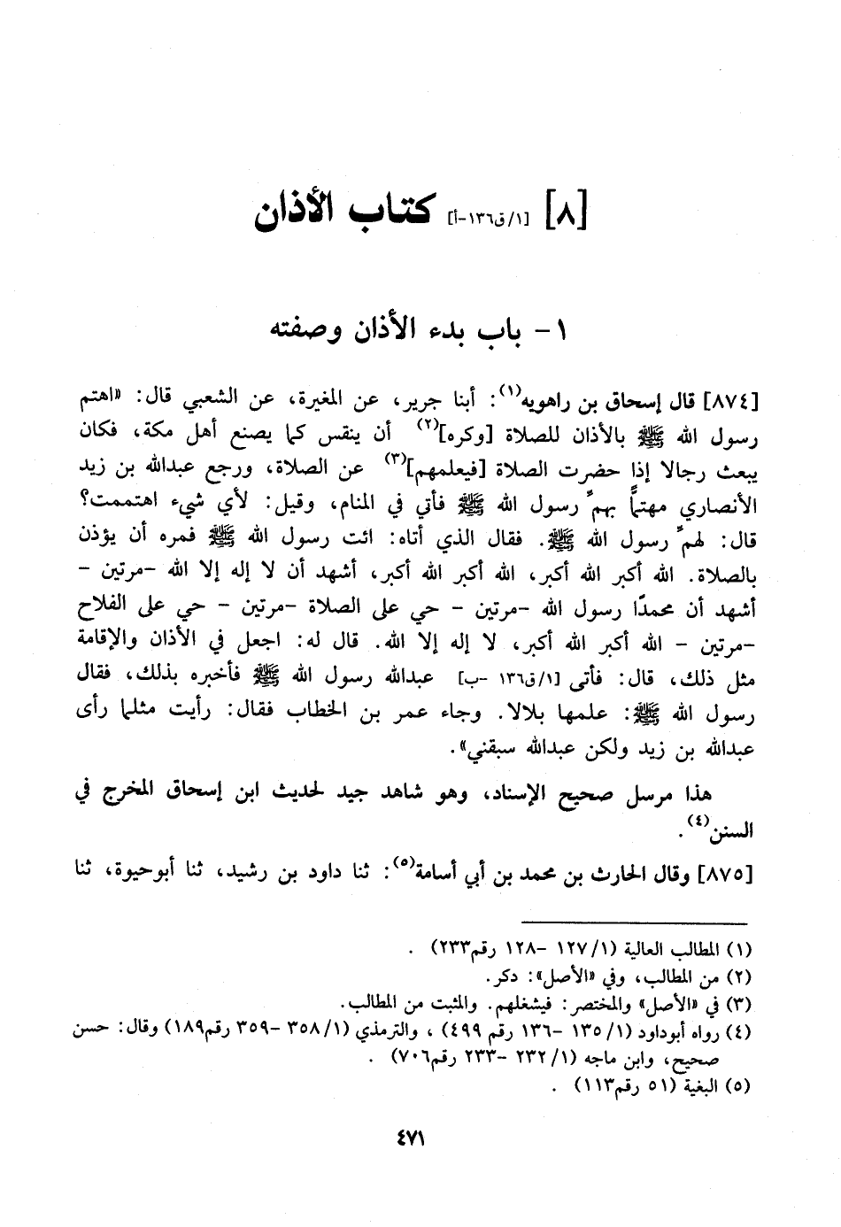 874 - قَالَ إسحاق بن راهويه: أبنا جَرِيرٌ، عَنِ الْمُغِيرَةِ، عَنِ الشَّعْبِيِّ قَالَ: "اهْتَمَّ رَسُولُ اللَّهِ - صَلَّى اللَّهُ عَلَيْهِ وَسَلَّمَ - بِالْأَذَانِ للصلاة وكره أَنْ يَنْقُسَ كَمَا يَصْنَعُ أَهْلُ مَكَّةَ، فَكَانَ يبعث رجالا إذا حضرت الصلاة فيعلمهم عَنِ الصَّلَاةِ، وَرَجَعَ عَبْدُ اللَّهِ بْنُ زَيْدٍ الْأَنْصَارِيُّ مُهْتَمًّا بِهَمِّ رَسُولِ اللَّهِ - صَلَّى اللَّهُ عَلَيْهِ وَسَلَّمَ - فَأُتِيَ فِي الْمَنَامِ، وَقِيلَ: لِأَيِّ شَيْءٍ اهْتَمَمْتَ؟ قَالَ: لِهَمِّ رَسُولِ اللَّهِ - صَلَّى اللَّهُ عَلَيْهِ وَسَلَّمَ -. فَقَالَ الَّذِي أَتَاهُ: ائْتِ رَسوُلَ اللَّهِ - صَلَّى اللَّهُ عَلَيْهِ وَسَلَّمَ - فَمُرْهُ أَنْ يُؤَذِّنَ بِالصَّلَاةِ.