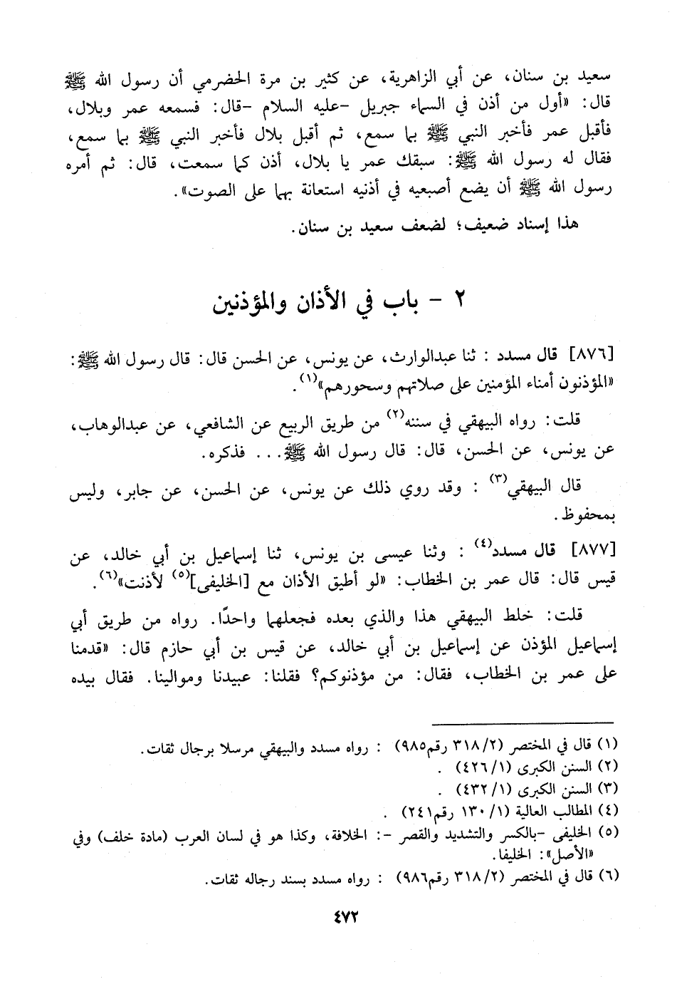 877 - قَالَ مُسَدَّدٌ: وَثَنَا عِيسَى بْنُ يُونُسَ، ثَنَا إِسْمَاعِيلُ بْنُ أَبِي خَالِدٍ، عَنْ قَيْسٍ قَالَ: قَالَ عُمَرُ بْنُ الْخَطَّابِ: "لَوْ أُطِيقُ الْأَذَانَ مَعَ الْخِلِّيفَى لَأَذَّنْتُ ".