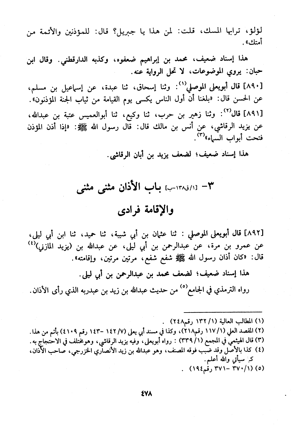 892 - قَالَ أَبُو يَعْلَى الْمَوْصِلِيُّ: ثَنَا عُثْمَانُ بْنُ أَبِي شَيْبَةَ، ثَنَا حُمَيْدٌ، ثَنَا ابْنُ أَبِي لَيْلَى، عَنْ عَمْرِو بْنِ مُرَّةَ، عَنْ عَبْدِ الرَّحْمَنِ بْنِ أَبِي لَيْلَى، عَنْ عَبْدِ اللَّهِ بْنِ (يزيد المازني) قَالَ: "كَانَ أَذَانُ رَسُولِ اللَّهِ - صَلَّى اللَّهُ عليه وسلم - شفع شفع، مَرَّتَيْنِ مَرَّتَيْنِ، وَإِقَامَتُهُ ".