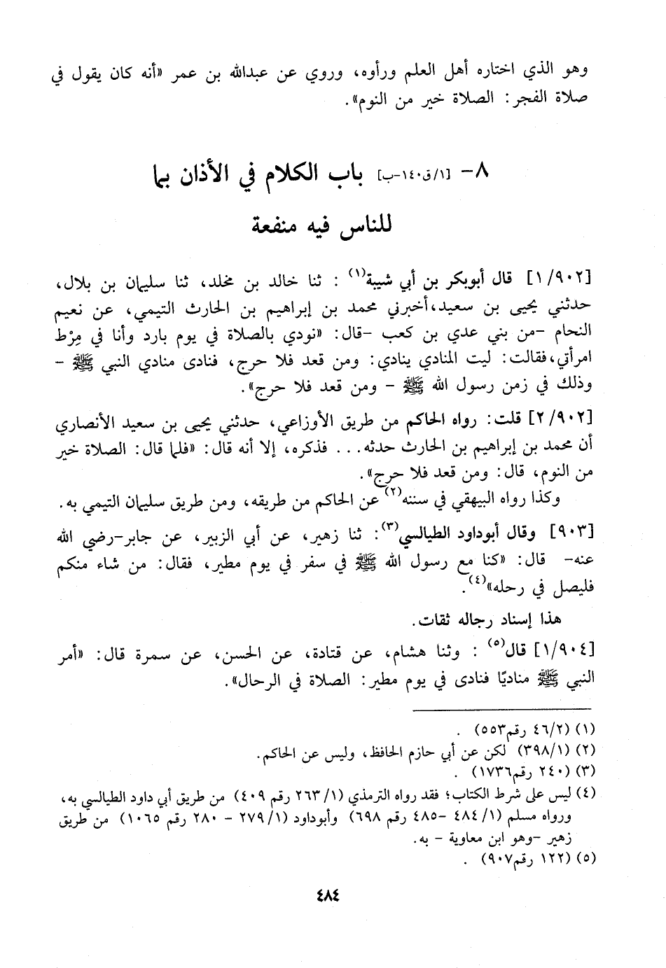 902 / 1 - قَالَ أَبُو بَكْرِ بْنُ أَبِي شَيْبَةَ: ثَنَا خَالِدُ بْنُ مُخَلَّدٍ، ثَنَا سُلَيْمَانُ بْنُ بِلَالٍ، حَدَّثَنِي يَحْيَى بْنُ سَعِيدٍ، أَخْبَرَنِي مُحَمَّدُ بْنُ إِبْرَاهِيمَ بْنِ الْحَارِثِ التَّيْمِيُّ، عَنْ نُعَيْمٍ النَّحَّامِ- مِنْ بَنِي عَدِيِّ بْنِ كَعْبٍ- قَالَ: "نُودِيَ بِالصَّلَاةِ فِي يَوْمٍ بَارِدٍ وَأَنَا فِي مِرْط امْرَأَتِي، فَقَالَتْ: لَيْتَ الْمُنَادِيَ يُنَادِي: وَمَنْ قَعَدَ فَلَا حَرَجَ، فَنَادَى مُنَادِي النَّبِيِّ - صَلَّى اللَّهُ عَلَيْهِ وَسَلَّمَ - وذلك في زمن رَسُولِ اللَّهِ - صَلَّى اللَّهُ عَلَيْهِ وَسَلَّمَ - وَمَنْ قَعَدَ فَلَا حَرَجَ ".