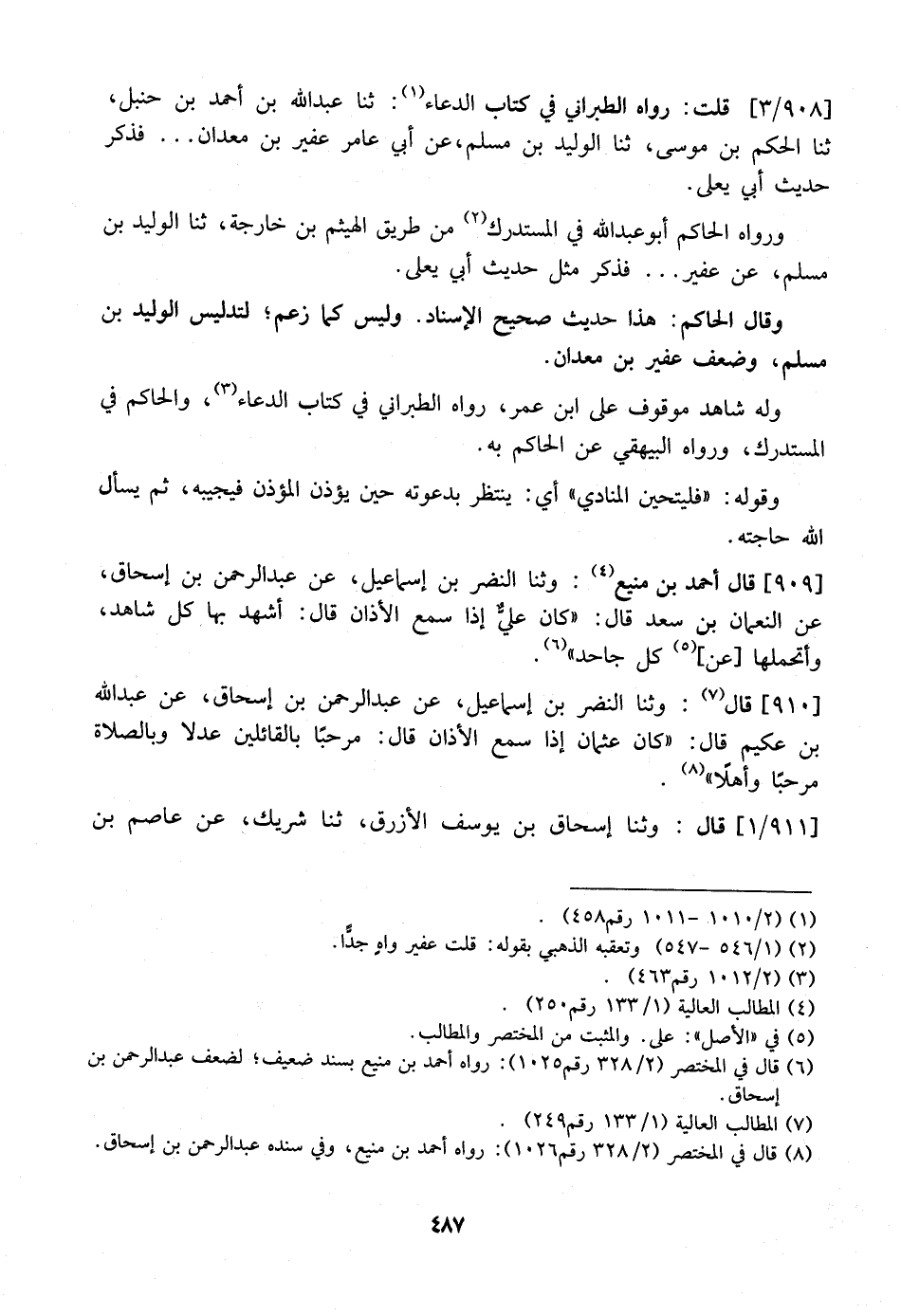 909 - قَالَ أَحْمَدُ بْنُ مَنيِعٍ: وَثَنَا النَّضْرُ بْنُ إِسْمَاعِيلَ، عَنْ عَبْدُ الرَّحْمَنِ بْنُ إِسْحَاقَ، عَنِ النُّعْمَانَ بْنِ سَعْدٍ قَالَ: "كَانَ عليٌّ إِذَا سَمِعَ الْأَذَانَ قال: أشهد بها كل شاهد، وأتحملها عن كُلِّ جَاحِدٍ".