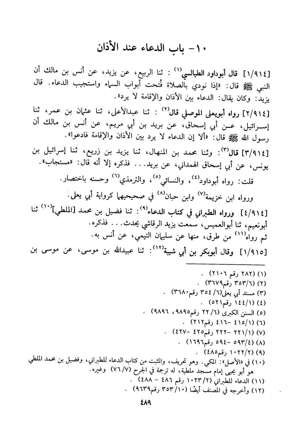 914 / 2 - رَوَاهُ أَبوُ يَعْلَى الْمَوْصِلِيُّ قَالَ: ثَنَا عَبْدُ الْأَعْلَى، ثَنَا عُثْمَانُ بْنُ عُمَرَ، ثَنَا إِسْرَائِيلُ، عَنْ أَبِي إِسْحَاقَ، عَنِ بُرَيْدِ بْنِ أَبِي مريم، عَنْ أَنَسِ بْنِ مَالِكٍ أَنّ رَسُولَ اللَّهِ - صَلَّى اللَّهُ عَلَيْهِ وَسَلَّمَ - قَالَ: "أَلَا إِنَّ الدُّعَاءَ لَا يُرَدُّ بَيْنَ الْأَذَانِ وَالْإِقَامَةِ فَادْعُوا".