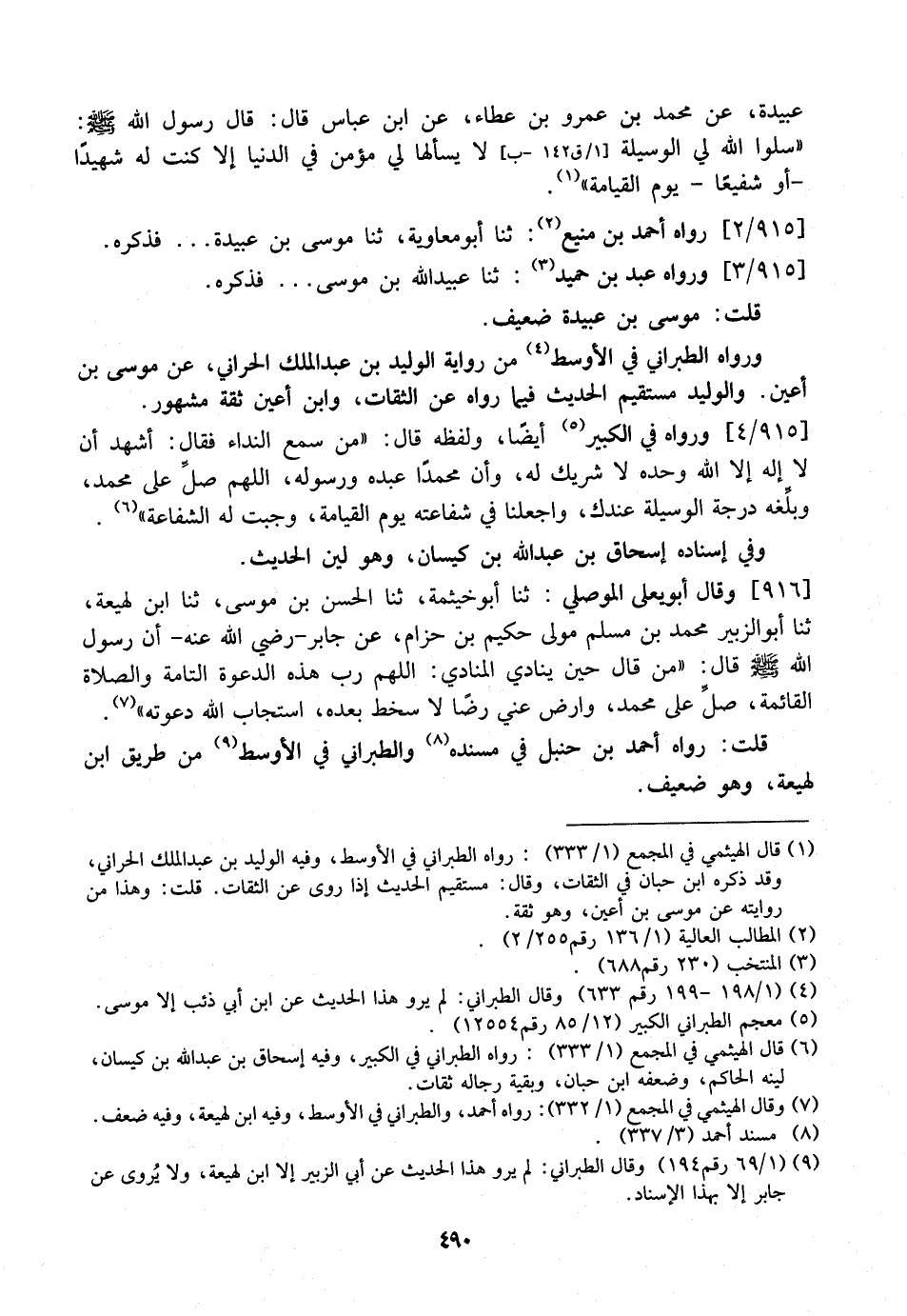 915 / 4 - وَرَوَاهُ فِي الْكَبِيرِ أَيْضًا، وَلَفْظُهُ قَالَ: "مَنْ سَمِعَ النِّدَاءَ فَقَالَ: أَشْهَدُ أَنْ لَا إِلَهَ إِلَّا اللَّهُ وَحْدَهُ لَا شَرِيكَ لَهُ، وَأَنَّ مُحَمَّدًا عَبْدُهُ وَرَسُولُهُ، اللَّهُمَّ صلِّ عَلَى مُحَمَّدٍ، وبلِّغه دَرَجَةَ الْوَسِيلَةِ عِنْدَكَ، وَاجْعَلْنَا فِي شَفَاعَتِهِ يَوْمَ الْقِيَامَةِ، وَجَبَتْ لَهُ الشَّفَاعَةُ".