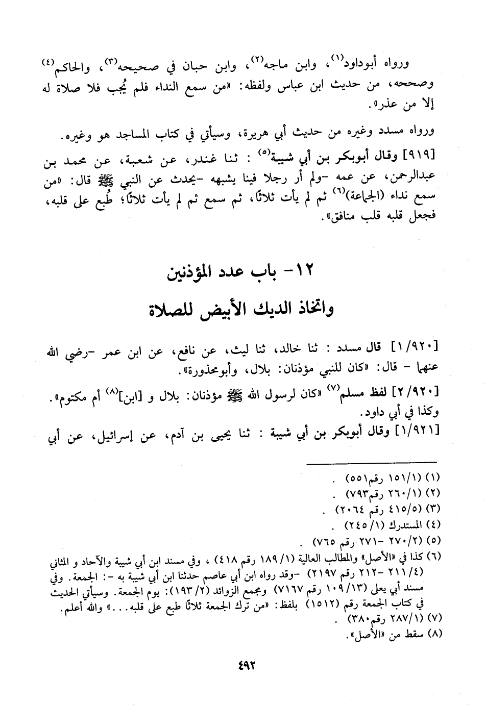 919 - وَقَالَ أَبُو بَكْرِ بْنُ أَبِي شَيْبَةَ: ثنا غندر، عن شعبة، عن محمد بن عبد الرحمن، عن عمه- ولم أر رجلا فينا يشبهه- يُحَدِّثُ عَنِ النَّبِيِّ - صَلَّى اللَّهُ عَلَيْهِ وَسَلَّمَ - قَالَ: "من سمع نداء (الجماعة) ثم لم يأت ثلاثًا، ثم سمع ثم لم يأت ثلاثًا، طُبع على قلبه، فجعل قلبه قلب منافق ".
