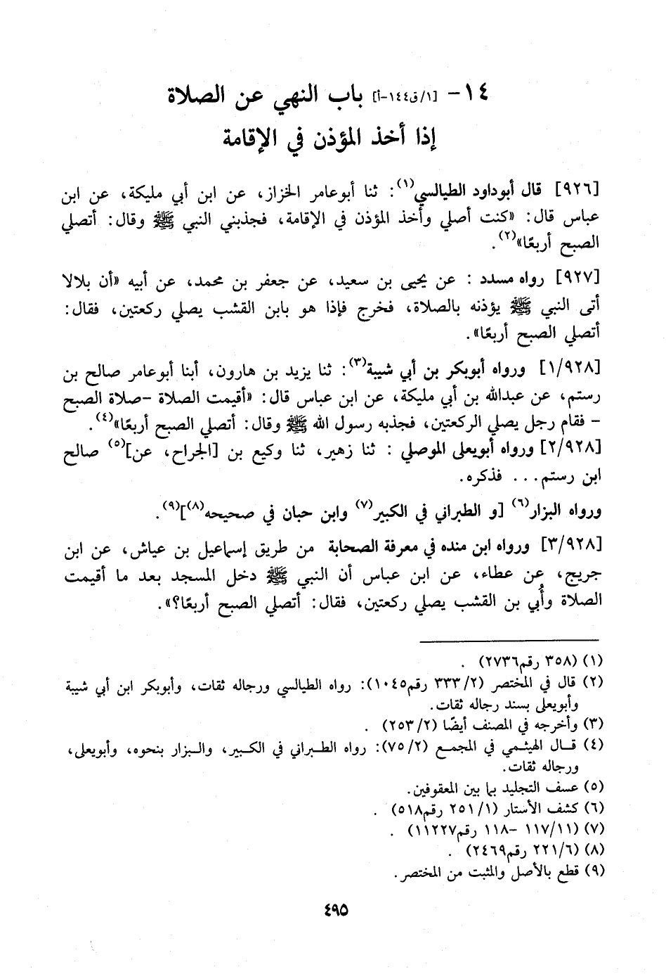 926 - قَالَ أَبُو دَاوُدَ الطَّيَالِسِيُّ: ثَنَا أَبُو عَامِرٍ الخزاز، عَنِ ابْنِ أَبِي مُلَيْكَةَ، عَنِ ابْنِ عَبَّاسٍ قال: "كنت أصلي وأخذ المؤذن في الإقامة، فجذبني النبي - صلى الله عليه وسلم - وقال: أتصلي الصبح أربعًا".