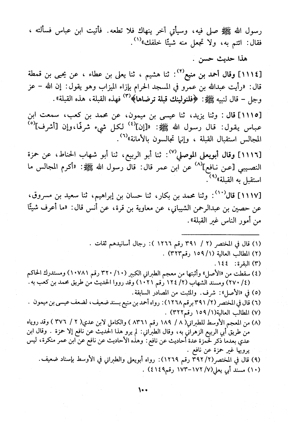1116 - وَقَالَ أَبُو يَعْلَى الْمَوْصِلِيُّ: ثَنَا أَبُو الرَّبِيعِ، ثَنَا أَبُو شِهَابٍ الْحَنَّاطُ، عَنْ حَمْزَةَ النَّصِيبِيِّ عَنْ نَافِعٍ، عَنِ ابْنِ عُمَرَ قَالَ: قَالَ رَسُولُ اللَّهِ - صَلَّى اللَّهُ عَلَيْهِ وَسَلَّمَ -: "أَكْرَمُ الْمَجَالِسِ مَا اسْتُقْبِلَ بِهِ الْقِبْلَةُ".