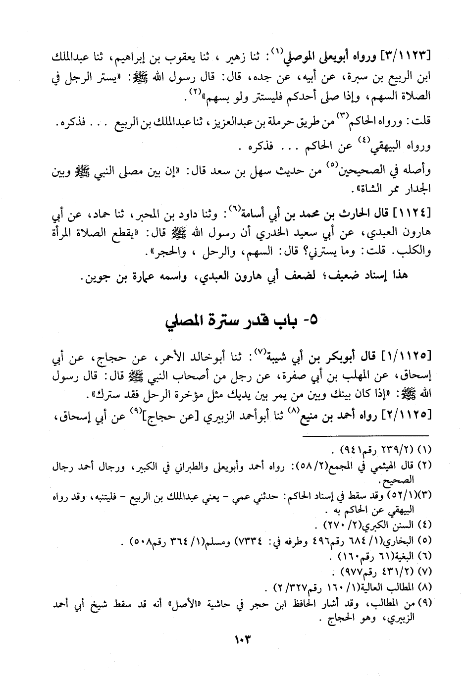 1123 / 3 - وَرَوَاهُ أَبُو يَعْلَى الْمُوصِلِيُّ: ثَنَا زُهَيْرٌ، ثَنَا يعقوب بن إبراهيم، ثنا عبد الملك ابن الرَّبِيعِ بْنِ سَبْرَةَ، عَنْ أَبِيهِ، عَنْ جَدِّهِ، قَالَ: قَالَ رَسُولُ اللَّهِ - صَلَّى اللَّهُ عَلَيْهِ وَسَلَّمَ -: ((يَسْتُرُ الرَّجُلَ فِي الصَّلَاةِ السَّهْمُ، وَإِذَا صَلَّى أَحَدُكُمْ فَلْيَسْتَتِرْ وَلَوْ بِسَهْمٍ ".