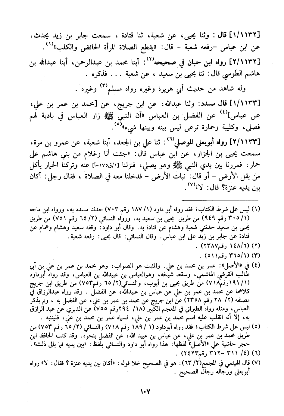 1133 / 2 - رَوَاهُ أَبُو يَعْلَى الْمَوْصِلِيُّ: ثَنَا عَلِيُّ بْنُ الْجَعْدِ، أبنا شُعْبَةُ، عَنْ عَمْرِو بْنِ مُرَّةَ، سَمِعْتُ يَحْيَى بن الْجَزَّارَ، عَنِ ابْنِ عَبَّاسٍ قَالَ: "جِئْتُ أَنَا وَغُلَامٌ مِنْ بَنِي هَاشِمٍ عَلَى حِمَارٍ، فَمَرَرْنَا بَيْنَ يَدَيِ النَّبِيِّ - صَلَّى اللَّهُ عَلَيْهِ وَسَلَّمَ - وَهُوَ يُصَلِّي، فَنَزَلْنَا عَنْهُ وَتَرَكْنَا الْحِمَارَ يَأْكُلُ مِنْ بَقْلِ الْأَرْضِ- أَوْ قَالَ: نَبَاتِ الْأَرْضِ- فَدَخَلْنَا مَعَهُ فِي الصَّلَاةِ، فَقَالَ رَجُلٌ: أَكَانَ بَيْنَ يَدَيْهِ عَنْزَةٌ؟ قَالَ: لَا".