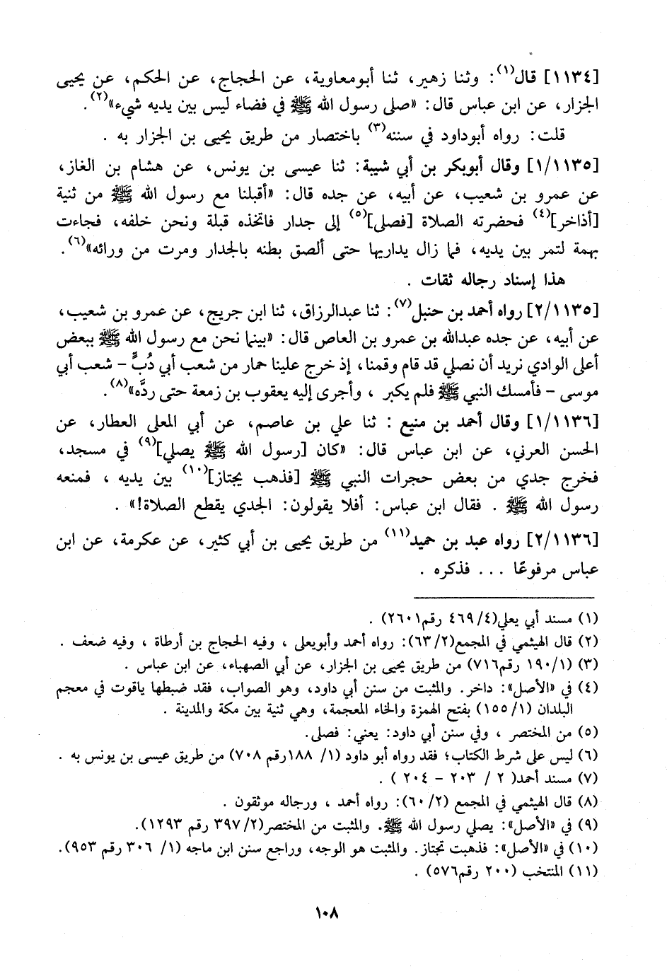 1134 - قَالَ: وثنا زُهَيْرٌ، ثَنَا أَبُو مُعَاوِيَةَ، عَنِ الْحَجَّاجِ، عَنِ الْحَكَمِ، عن يحيى الْجَزَّارِ، عَنِ ابْنِ عَبَّاسٍ قَالَ: "صَلَّى رَسُولُ اللَّهِ - صَلَّى اللَّهُ عَلَيْهِ وَسَلَّمَ - فِي فَضَاءٍ لَيْسَ بَيْنَ يَدَيْهِ شَيْءٌ". قُلْتُ: رَوَاهُ أَبُو دَاوُدَ فِي سُنَنِهِ بِاخْتِصَارٍ مِنْ طَرِيقِ يَحْيَى بْنِ الْجَزَّارِ بِهِ.