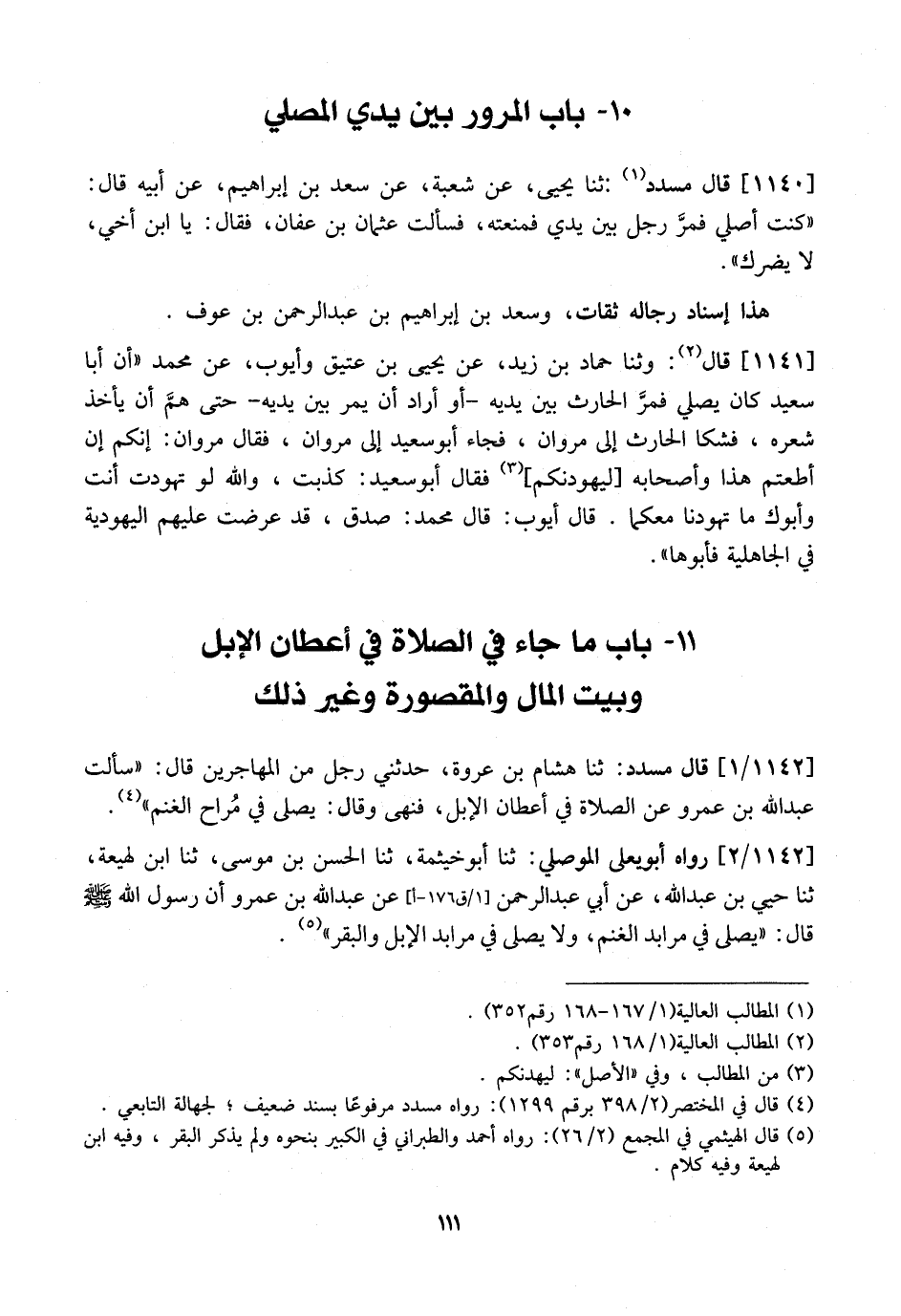 1142 / 1 - قَالَ مُسَدَّدٌ: ثَنَا هِشَامُ بْنُ عُرْوَةَ، حَدَّثَنِي رَجُلٌ مِنَ الْمُهَاجِرِينَ قَالَ: "سَأَلْتُ عَبْدَ اللَّهِ بْنَ عَمْرٍو عَنِ الصَّلَاةِ فِي أَعْطَانِ الْإِبِلِ، فَنَهَى وَقَالَ: يُصَلَّى فِي مُراح الْغَنَمِ ".