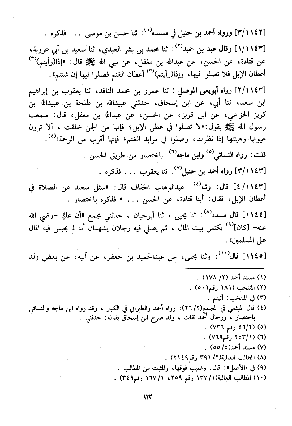 1143 / 2 - رَوَاهُ أَبُو يَعْلَى الْمَوْصِلِيُّ: ثَنَا عَمْرُو بْنُ مُحَمَّدٍ الناقد، ثنا يعقوب بن إبراهيم ابن سَعْدٍ، ثَنَا أَبِي، عَنِ ابْنِ إِسْحَاقَ، حَدَّثَنِي عبيد الله بن طلحة بن عبيد اللَّهِ بْنِ كُرَيْزٍ الْخُزَاعِيُّ، عَنِ ابْنِ كُرَيْزٍ، عَنِ الْحَسَنِ، عَنْ عَبْدِ اللَّهِ بْنِ مُغَفَّلٍ، قَالَ: سَمِعْتُ رَسُولَ اللَّهِ - صَلَّى اللَّهُ عَلَيْهِ وَسَلَّمَ - يَقُولُ: "لَا تُصَلُّوا فِي عَطَنِ الْإِبِلِ فَإِنَّهَا مِنَ الْجِنِّ خُلِقَتْ، أَلَا تَرَوْنَ عُيُونَهَا وهيئتها إِذَا نَظَرَتْ، وَصَلُّوا فِي مَرَابِدِ الْغَنَمِ فَإِنَّهَا أَقْرَبُ مِنَ الرَّحْمَةِ)