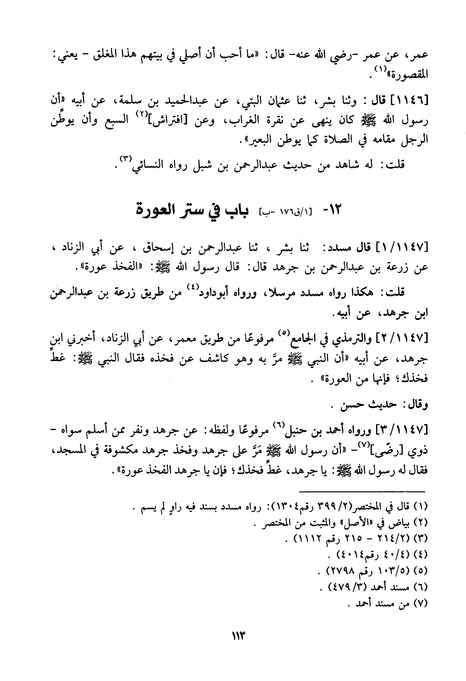 1147 / 3 - وَرَوَاهُ أَحْمَدُ بْنُ حَنْبَلٍ مَرْفُوعًا وَلَفْظُهُ: عَنْ جرهد ونفر ممن أسلم سواه- ذوي رضى - "أن رسول الله - صلى الله عليه وسلم - مَرَّ عَلَى جَرْهَدٍ وَفَخِذُ جَرْهَدٍ مَكْشُوفَةٌ فِي الْمَسْجِدِ، فَقَالَ لَهُ رَسُولُ اللَّهِ - صَلَّى اللَّهُ عَلَيْهِ وسلم -: يا جرهد، غطِّ فخذك فإن يَا جَرْهَدُ الْفَخِذُ عَوْرَةٌ".