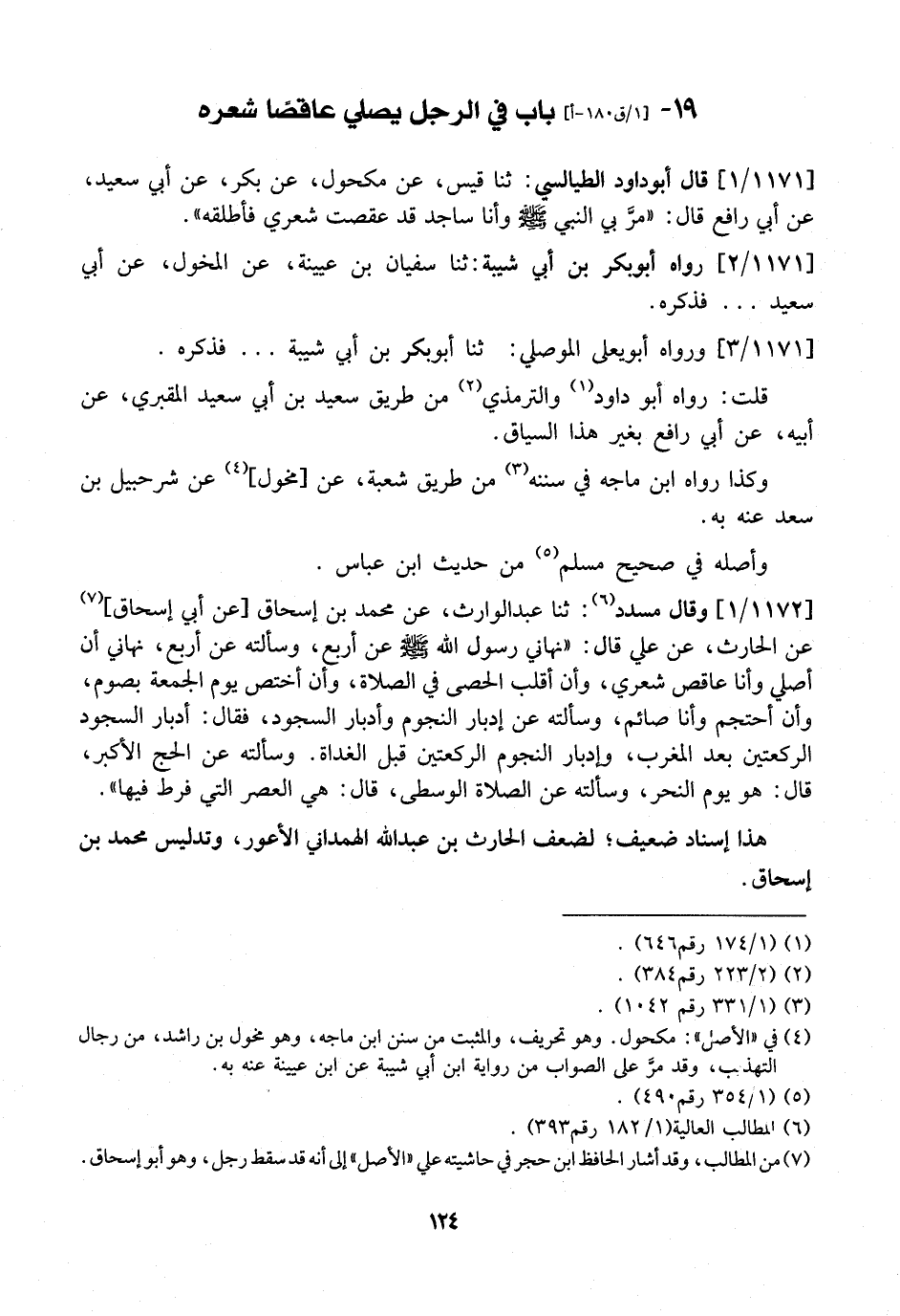 1172 / 1 - وَقَالَ مُسَدَّدٌ: ثَنَا عَبْدُ الْوَارِثِ، عَنْ مُحَمَّدِ بْنِ إسحاق عَنْ أَبِي إِسْحَاقَ، عَنِ الْحَارِثِ، عَنْ عَلِيٍّ قَالَ: "نَهَانِي رَسُولُ اللَّهِ - صَلَّى اللَّهُ عَلَيْهِ وَسَلَّمَ - عَنْ أَرْبَعٍ، وَسَأَلْتُهُ عَنْ أَرْبَعٍ، نَهَانِي أَنْ أُصَلِّيَ وَأَنا عَاقِصٌ شَعْرِي، وَأَنْ أُقَلِّبَ الْحَصَى فِي الصَّلَاةِ، وَأَنْ أَخْتَصَّ يَوْمَ الْجُمُعَةِ بِصَوْمٍ، وَأَنْ أَحْتَجِمَ وَأَنَا صَائِمٌ، وَسَأَلْتُهُ عَنْ أَدْبَارِ النجوم وأدبار السجود، فقال: أدبار السجود الركعتين بعد المغرب، وإدبار النجوم الركعتين قَبْلَ الْغَدَاةِ. وَسَأَلْتُهُ عَنِ الْحَجِّ الْأَكْبَرِ، قَالَ: هُوَ يَوْمُ النَّحْرِ، وَسَأَلْتُهُ عَنِ الصَّلَاةِ الْوُسْطَى، قَالَ: هِيَ الْعَصْرُ الَّتِي فُرِطَ فِيهَا". هَذَا إِسْنَادٌ ضَعِيفٌ لِضَعْفِ الْحَارِثِ بْنِ عَبْدِ اللَّهِ الْهَمْدَانِيِّ الْأَعْوَرِ، وَتَدْلِيسِ مُحَمَّدِ بْنِ إِسْحَاقَ.