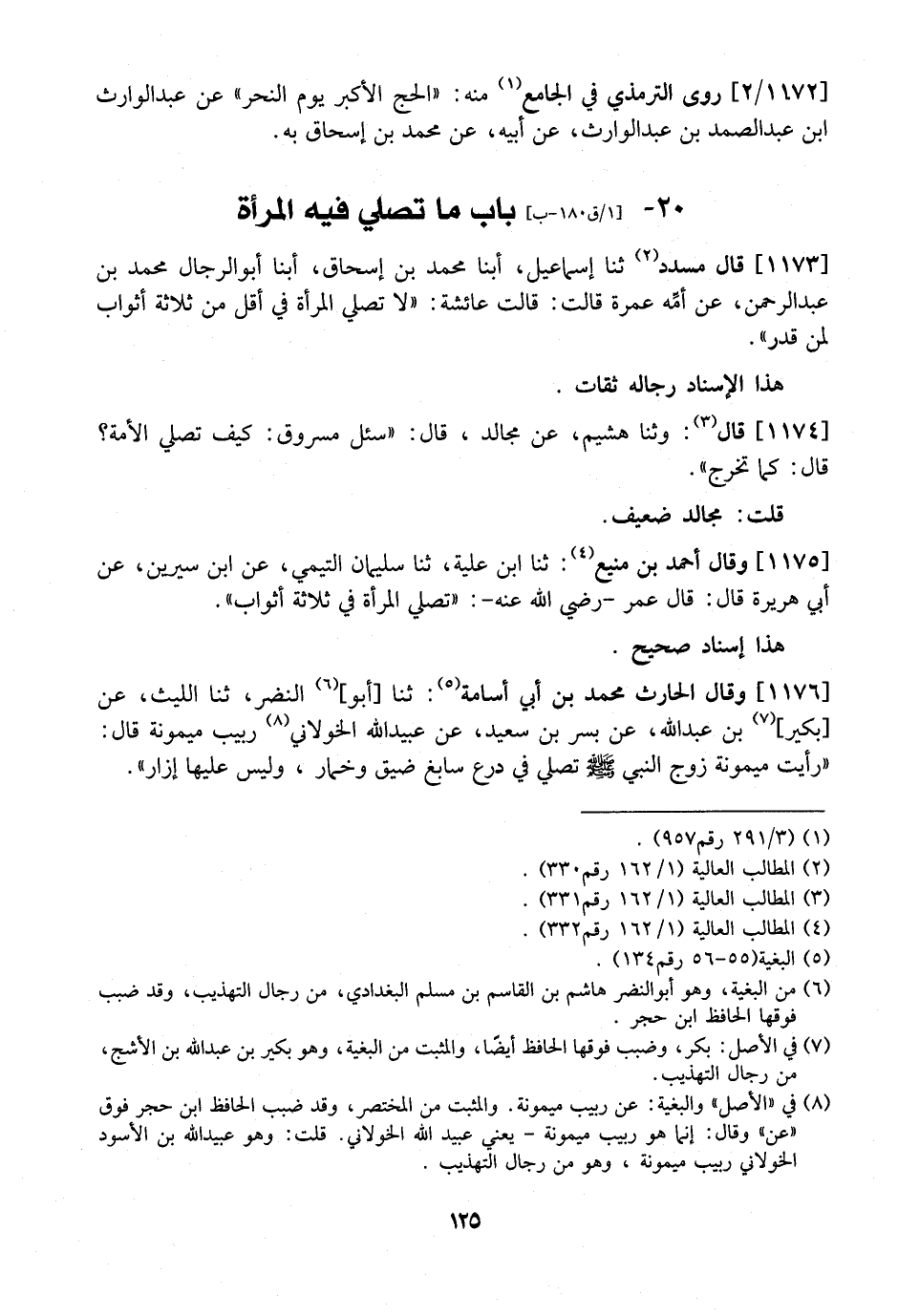 1173 - قَالَ مُسَدَّدٌ ثَنَا إِسْمَاعِيلُ، أبنا محمد بن إسحاق، أبنا أَبُو الرِّجَالِ مُحَمَّدُ بْنُ عَبْدِ الرَّحْمَنِ، عَنْ أمِّه عَمْرَةَ قَالَتْ: قَالَتْ عَائِشَةُ: "لَا تُصَّلِي الْمَرْأَةُ فِي أَقَلَّ مِنْ ثَلَاثَةِ أَثْوَابٍ لِمَنْ قدر".