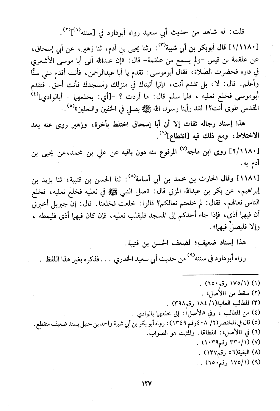 1180 / 1 - قَالَ أَبُو بَكْرِ بْنُ أَبِي شَيْبَةَ: وَثَنَا يَحْيَى بْنُ آدَمَ، ثَنَا زُهَيْرٌ، عَنْ أَبِي إِسْحَاقَ، عَنْ علقمة بن قيس- ولم يَسْمَعْ مِنْ عَلْقَمَةَ- قَالَ: "إِنَّ عَبْدَ اللَّهِ أَتَى أَبَا مُوسَى الْأَشْعَرِيَّ فِي دَارِهِ فَحَضَرَتِ الصَّلَاةُ، فَقَالَ أَبُو مُوسَى: تَقَدَّمْ يَا أَبَا عَبْدِ الرَّحْمَنِ، فَأَنْتَ أَقْدَمُ مِنِّي سِنًّا وَأَعْلَمُ. قَالَ: لَا، بَلْ تَقَدَّمْ أَنْتَ، فَإِنَّمَا أَتَيْنَاكَ فِي مَنْزِلِكَ وَمَسْجِدِكَ فَأَنْتَ أَحَقُّ. فَتَقَدَّمَ أَبُو موسى فخلع نعليه، فلما سلم قال: ما أردت؟ - أي: بخلعهما- أبالوادي، الْمُقَدَّسِ طُوًى أَنْتَ؟ لَقَدْ رَأَيْنَا رَسُولَ اللَّهِ يِه يصلي في الخفين والنعلين "