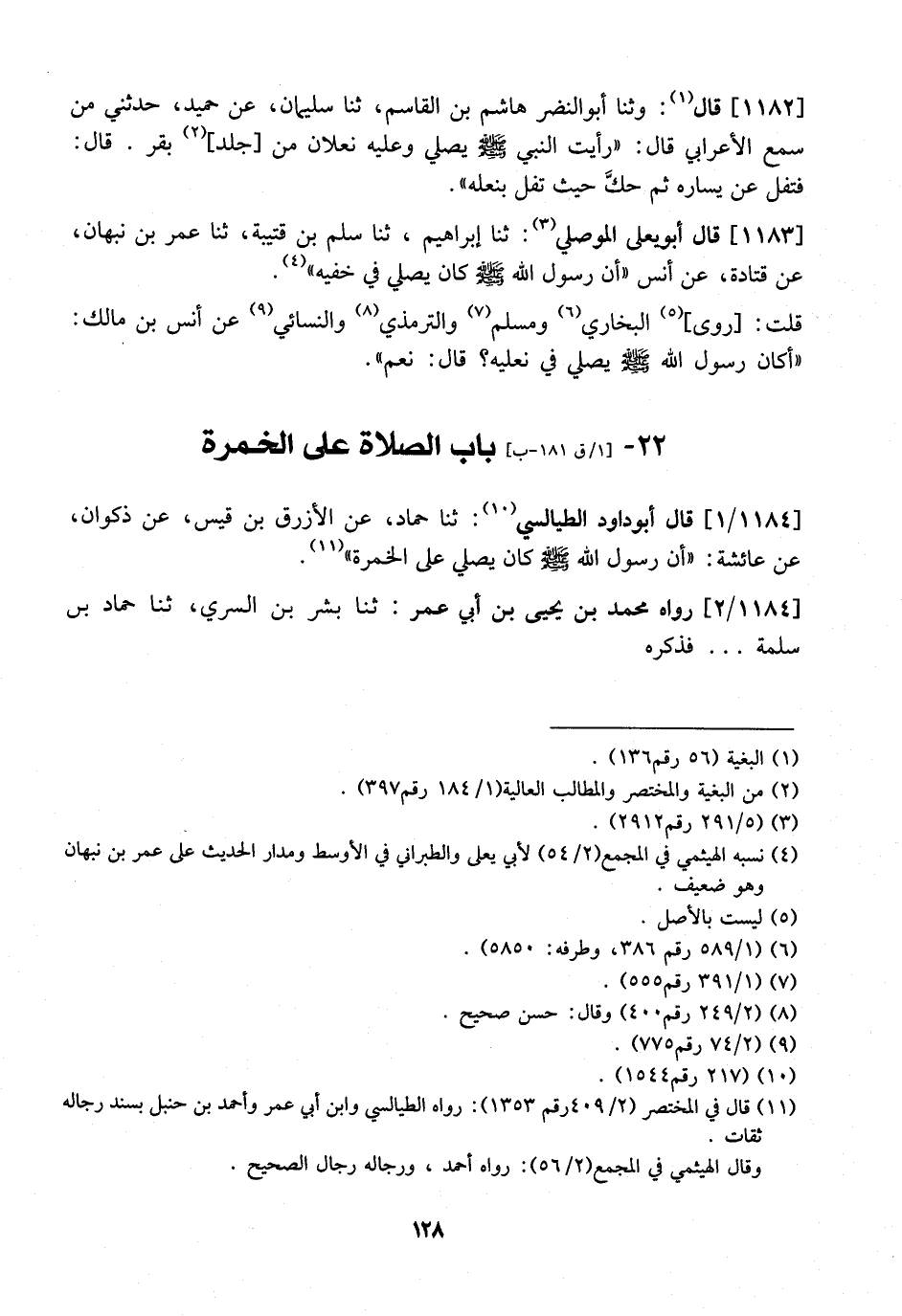 1183 - قال أَبُو يَعْلَى الْمَوْصِلِيُّ: ثَنَا إِبْرَاهِيمُ، ثَنَا سَلَمُ بْنُ قُتَيْبَةَ، ثَنَا عُمَرُ بْنُ نَبْهَانَ، عَنْ قَتَادَةَ، عَنْ أَنَسٍ "أَنّ رَسُولَ اللَّهِ - صَلَّى اللَّهُ عَلَيْهِ وَسَلَّمَ - كَانَ يُصَلِّي فِي خُفَّيْهِ ".