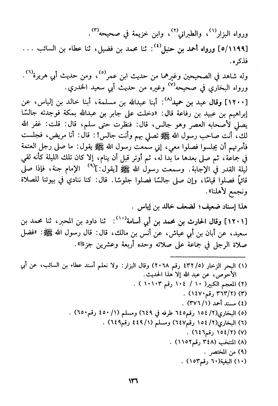 1200 - وقال عبد بن حميد: أبنا عبد الله بن مسلمة، أبنا خَالِدُ بْنُ إِلْيَاسَ، عَنْ إِبْرَاهِيمَ بْنِ عُبَيْدِ بْنِ رِفَاعَةَ قَالَ: "دَخَلْتُ عَلَى جَابِرِ بْنِ عَبْدِ اللَّهِ بِمَكَّةَ فَوَجَدْتُهُ جَالِسًا يُصَلِّي لِأَصْحَابِهِ الْعَصْرَ وَهُوَ جَالِسٌ، قَالَ: فَنَظَرْتُ حَتَّى سَلَّمَ، قَالَ: قُلْتُ: غَفَرَ اللَّهُ لَكَ، أَنْتَ صَاحِبُ رَسُولِ اللَّهِ - صَلَّى اللَّهُ عَلَيْهِ وَسَلَّمَ - تُصَلِّي بِهِمْ وَأَنْتَ جَالِسٌ: قَالَ: أَنَا مَرِيضٌ، فَجَلَسْتُ فأمرتهم أن يجلسوا فصلوا معي، إني سمعت رسول الله يَقُولُ: مَا صَلَّى رَجُلٌ الْعَتْمَةَ فِي جَمَاعَةٍ، ثُمَّ صَلَّى بَعْدَهَا مَا بَدَا لَهُ، ثُمَّ أَوْتَرَ قَبْلَ أَنْ يَنَامَ، إِلَّا كَانَ تِلْكَ اللَّيْلَةَ كَأَنَّهُ لَقِيَ لَيْلَةَ الْقَدْرِ فِي الْإِجَابَةِ. وَسَمِعْتُ رَسُولَ اللَّهِ - صَلَّى اللَّهُ عَلَيْهِ وَسَلَّمَ - يَقُولُ الْإِمَامُ جُنَّةٌ، فَإِذَا صَلَّى قَائِمًا فَصَلُّوا قيامًا، وإن صلى جالسًا فصلوا جلولسًا. قَالَ: كُنَّا نُنَادِي فِي بُيُوتِنَا لِلصَّلَاةِ وَنَجْمَعُ لِأَهْلِنَا".