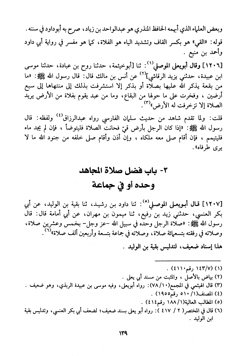 1207 - قَالَ أَبُو يَعْلَى الْمَوْصِلِيُّ: ثَنَا دَاوُدُ بْنُ رَشِيدٍ، ثَنَا بَقَيَّةُ بْنُ الْوَلِيدِ، عَنْ أَبِي بَكْرِ العنسي، حَدَّثَنِي زَيْدُ بْنُ رَفِيعٍ، ثَنَا مَيْمُونُ بْنُ مِهْرَانَ، عَنْ أَبِي أُمَامَةَ قَالَ: قَالَ رَسُولُ اللَّهِ - صَلَّى اللَّهُ عَلَيْهِ وَسَلَّمَ -: ((صَلَاةُ الرَّجُلِ وحده في سبيل الله- عز وجل- بخمسة وعشرين صلاة، وصلاته في رفقته بتسعمائة صَلَاةٍ، وَصَلَاتُهُ فِي جَمَاعَةٍ بِتِسْعَةٍ وَأَرْبَعِينَ أَلْفَ صَلَاةٍ.