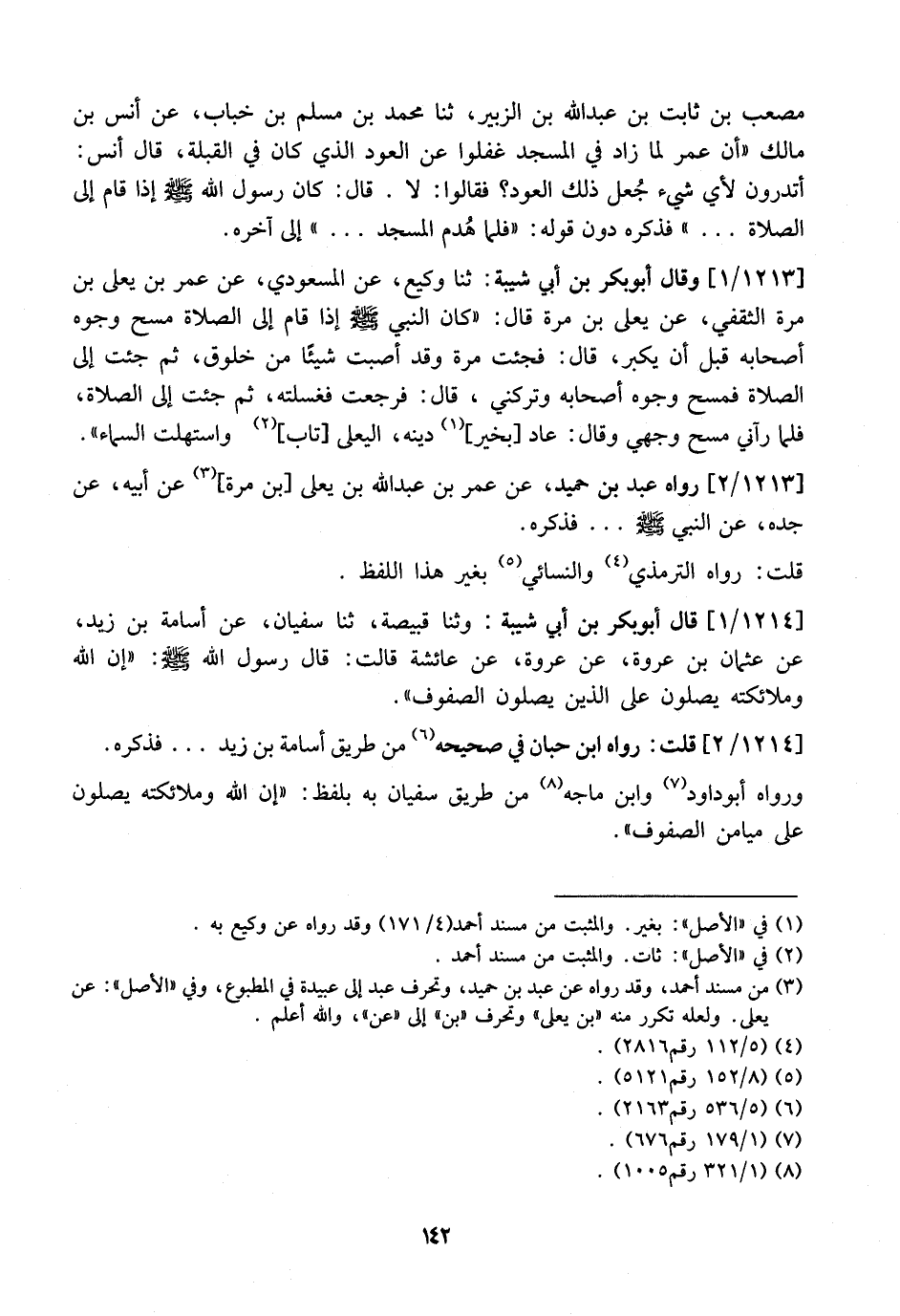 1213 / 1 - وَقَالَ أَبُو بَكْرِ بْنُ أَبِي شَيْبَةَ: ثنا وَكِيعٌ، عَنِ الْمَسْعُودِيِّ، عَنْ عُمَرَ بْنِ يَعْلَى بْنِ مُرَّةَ الثَّقَفِيِّ، عَنْ يَعْلَى بْنِ مُرَّةَ قَالَ: "كَانَ النَّبِيُّ - صَلَّى اللَّهُ عَلَيْهِ وَسَلَّمَ - إِذَا قَامَ إِلَى الصَّلَاةِ مَسَحَ وُجُوهَ أَصْحَابِهِ قَبْلَ أَنْ يُكَبِّرَ، قَالَ: فَجِئْتُ مَرَّةً وَقَدْ أَصَبْتُ شَيْئًا مِنْ خَلُوقٍ، ثُمَّ جِئْتُ إِلَى الصَّلَاةِ فَمَسَحَ وُجُوهَ أَصْحَابِهِ وَتَرَكَنِي، قَالَ: فَرَجَعْتُ فغسلته، جِئْتُ إِلَى الصَّلَاةِ، فَلَمَّا رَآنِي مَسَحَ وَجْهِي وقال: عاد بخير دينه، اليعلى تَابَ، وَاسْتَهَلَّتِ السَّمَاءُ.