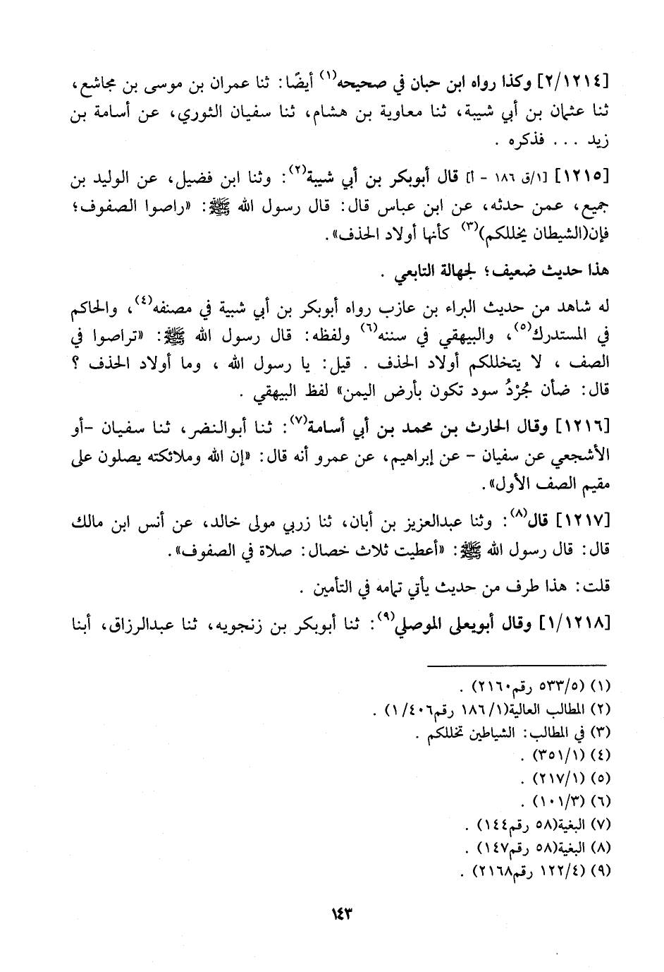 1215 - قَالَ أَبُو بَكْرِ بْنُ أَبِي شَيْبَةَ: وَثَنَا ابن فضيل، عَنِ الْوَلِيدِ بْنِ جُمَيْعٍ، عَمَّنْ حَدَّثَهُ، عَنِ ابْنِ عَبَّاسٍ قَالَ: قَالَ رَسُولُ اللَّهِ - صَلَّى اللَّهُ عَلَيْهِ وَسَلَّمَ - ((رَاصُّوا الصُّفُوفَ، فَإِنَّ (الشَّيْطَانَ يخللكم) كأنها أولاد الحذف.