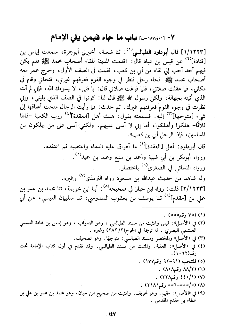 1223 / 1 - قَالَ أَبُو دَاوُدَ الطَّيَالِسِيُّ: ثَنَا شُعْبَةُ، أَخْبَرَنِي أبو جمرة، سمعت إياس بن قتادة، عَنْ قَيْسِ بْنِ عُبَادٍ قَالَ: "قَدِمْتُ الْمَدِينَةَ لِلِقَاءِ أَصْحَابِ مُحَمَّدٍ - صَلَّى اللَّهُ عَلَيْهِ وَسَلَّمَ - فَلَمْ يَكُنْ فِيهِمْ أَحَدٌ أَحَبَّ إِلَيَّ لِقَاءً مِنْ أُبَيِّ بْنِ كَعْبٍ، فَقُمْتُ فِي الصَّفِّ الْأَوَّلِ، وَخَرَجَ عُمَرُ مَعَهُ أَصْحَابُ مُحَمَّدٍ - صَلَّى اللَّهُ عَلَيْهِ وَسَلَّمَ - فَجَاءَ رَجُلٌ فَنَظَرَ فِي وُجُوهِ الْقَوْمِ فَعَرَفَهُمْ غَيْرِي، فَنَحَّانِي وَقَامَ فِي مَكَانِي، فَمَا عَقَلْتُ صَلَاتِي، فَلَمَّا فَرَغَتْ صَلَاتِي قال: يا فتى، لا يسوءك اللَّهُ، فَإِنِّي لَمْ آتِ الَّذِي أَتَيْتُهُ بِجَهَالَةٍ، وَلَكِنَّ رَسُولَ اللَّهِ - صَلَّى اللَّهُ عَلَيْهِ وَسَلَّمَ - قَالَ لَنَا: كُونُوا فِي الصَّفِّ الَّذِي يَلِينِي، وَإِنِّي نَظَرْتُ فِي وُجُوهِ الْقَوْمِ فَعَرَفْتُهُمْ غَيْرَكَ. ثم حدث: في رأيت الرجال متحت أعناقها إلى شيء متوحها إِلَيْهِ. فَسَمِعْتُهُ يَقُولُ: هَلَكَ أَهْلُ الْعُقْدَةِ، وَرَبِّ الْكَعْبَةِ- قَالَهَا ثَلَاثًا- هَلَكُوا وَأَهْلَكُوا، أَمَا إِنِّي لَا آسَى عَلَيْهِمْ، وَلَكِنِّي آسَى عَلَى مَنْ يُهْلَكُونَ مِنَ الْمُسْلِمِينَ، فَإِذَا الرَّجُلُ أُبَيُّ بْنُ كعب ".