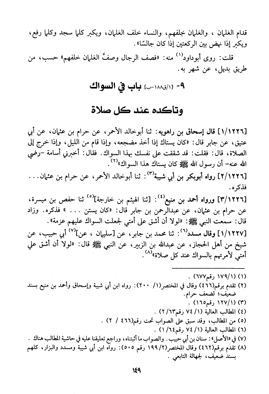 1226 / 1 - قَالَ إِسْحَاقُ بْنُ رَاهَوَيْهِ: ثَنَا أَبُو خَالِدٍ الْأَحْمَرُ، عَنْ حَرَامِ بْنِ عُثْمَانَ، عَنْ أَبِي عَتِيقٍ، عَنْ جَابِرٍ قَالَ: "كَانَ يَسْتَاكُ إِذَا أَخَذَ مَضْجَعَهُ، وَإِذَا قَامَ مِنَ اللَّيْلِ، وَإِذَا خَرَجَ إِلَى الصَّلَاةِ، قَالَ: فَقُلْتُ: قَدْ شَقَقْتَ عَلَى نَفْسِكَ بِهَذَا السِّوَاكِ. فَقَالَ: أَخْبَرَنِي أُسَامَةُ- رَضِيَ اللَّهُ عَنْهُ- أن رسول الله - صلى الله عليه وسلم - كَانَ يَسْتَاكُ هَذَا السِّوَاكَ ".