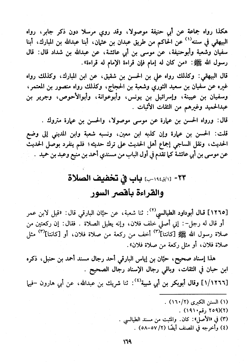 1265 - قَالَ أَبُو دَاوُدَ الطَّيَالِسِيُّ: ثَنَا شُعْبَةُ، عَنْ حيَّان الْبَارِقِيِّ قَالَ: "قِيلَ لِابْنِ عُمَرَ أَوْ قَالَ لَهُ رَجُلٌ-: إِنِّي أُصَلِّي خَلْفَ فُلَانٍ، وَإِنَّهُ يُطِيلُ الصَّلَاةَ. فَقَالَ: إِنَّ رَكْعَتَيْنِ مِنْ صَلَاةَ رَسُولِ اللَّهِ - صَلَّى اللَّهُ عَلَيْهِ وَسَلَّمَ - كَانَتَا أَخَفَّ مِنْ رَكْعَةٍ مِنْ صَلَاةِ فُلَانٍ، أَوْ كَانَتَا مِثْلَ صَلَاةِ فُلَانٍ، أَوْ مِثْلَ رَكْعَةٍ مِنْ صَلَاةِ فُلَانٍ ".